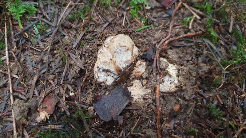 Ich habe ein wenig um den Pilz gegraben und auch eine ~1cm dicke Tannenwurzel gefunden, an der der Pilz zu wachsen scheint. Habe die Stelle jetzt über eine Woche aufgesucht, aber es scheinen sich keine Hütte, Stiele oder ähnliches zu bilden. Die Furchtkörper waren jedoch minimal größer im Durchmesser. Habe Ihn dieses Jahr, das erste Mal gefunden und vermute er wurde durch den starken Regen etwas freigespühlt.