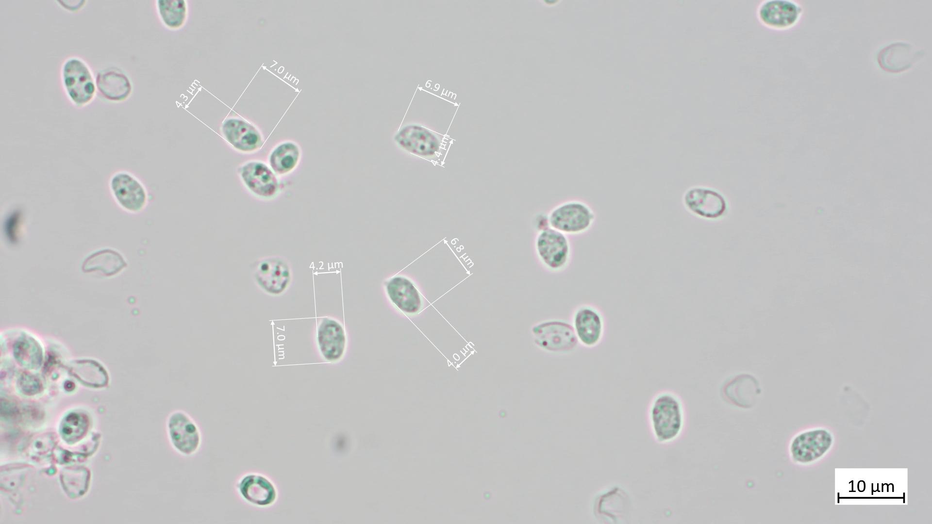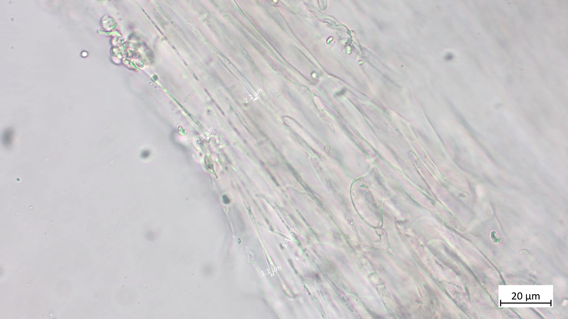 Zuerst zu den Sporen: Ich habe 30 Sporen gemessen und diese lagen bei 6.8 µm (6.4 - 7.4 µm) x 4.3 µm (3.9 - 4.8 µm), Q = 1.6. Die Sporen sind elliptisch, hyalin und mit Tropfen. Sie scheinen sehr empfindlich zu sein und neigen dazu auseinanderzufallen. Wenn man das so sagen kann. ![]()
