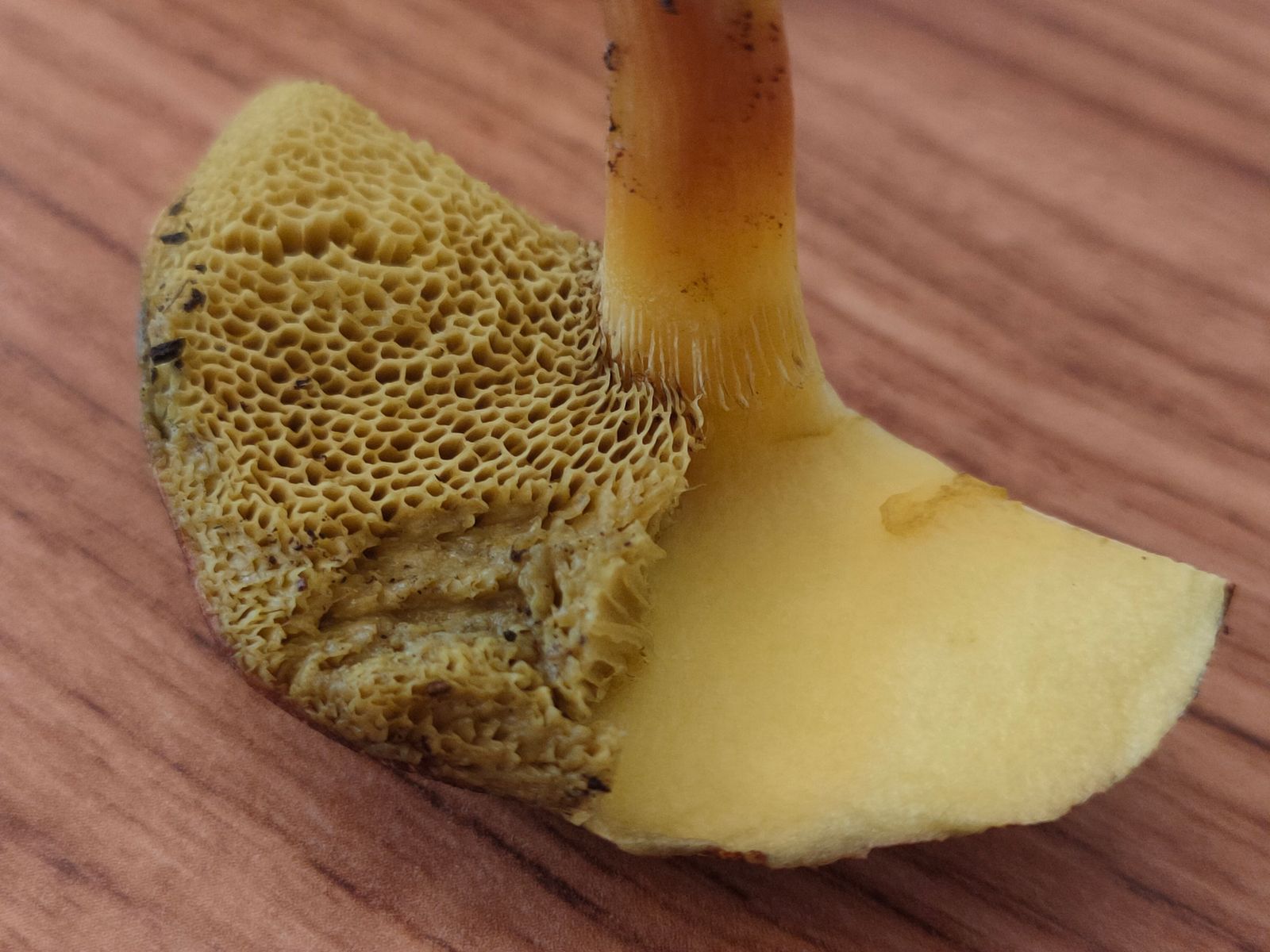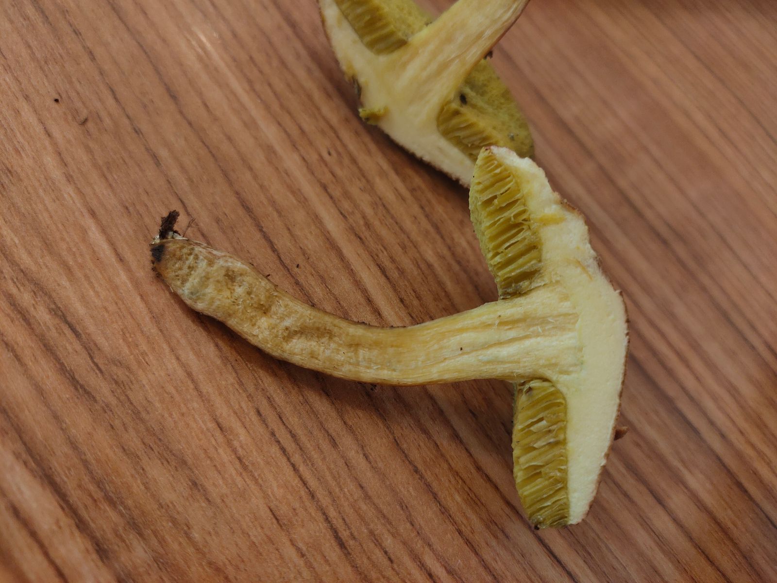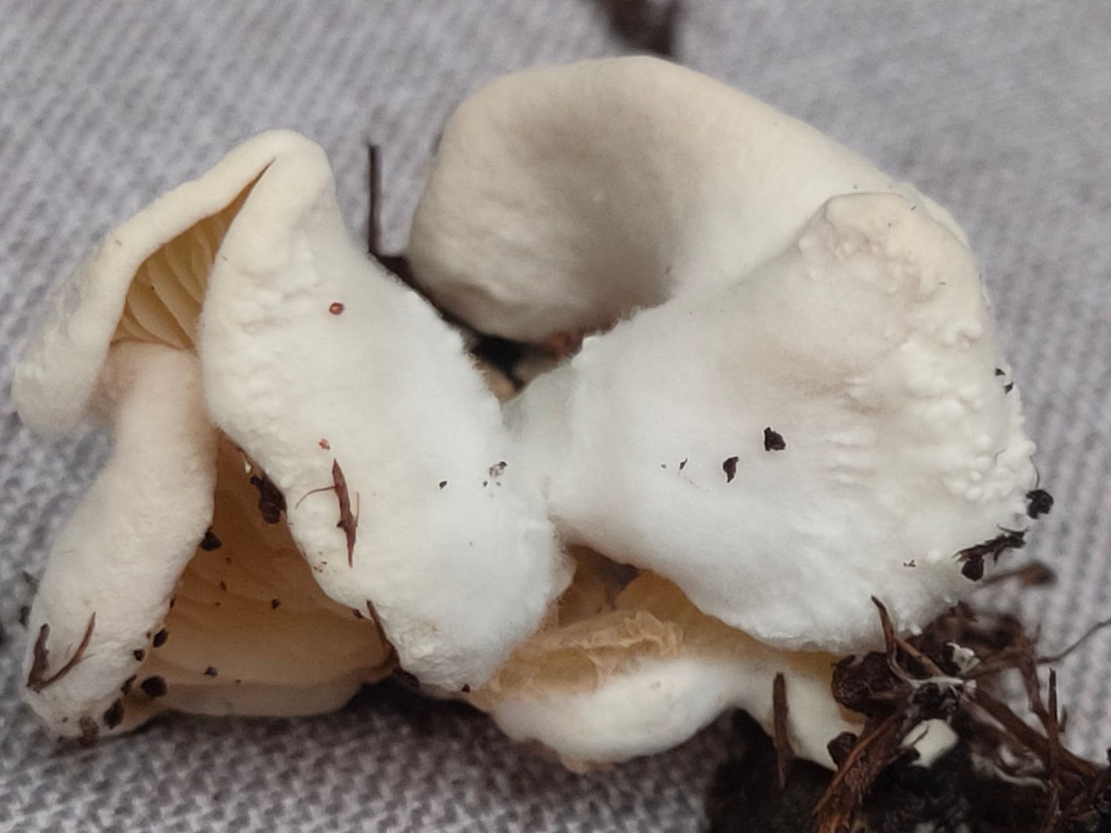 Ich sehe eine leichte Rötung/Rose in den leicht gelblichen Lamellen. Vielleicht ist es ein Entoloma oder Clitopilus oder doch keine heimische Art? Das SSP ist in arbeit.
