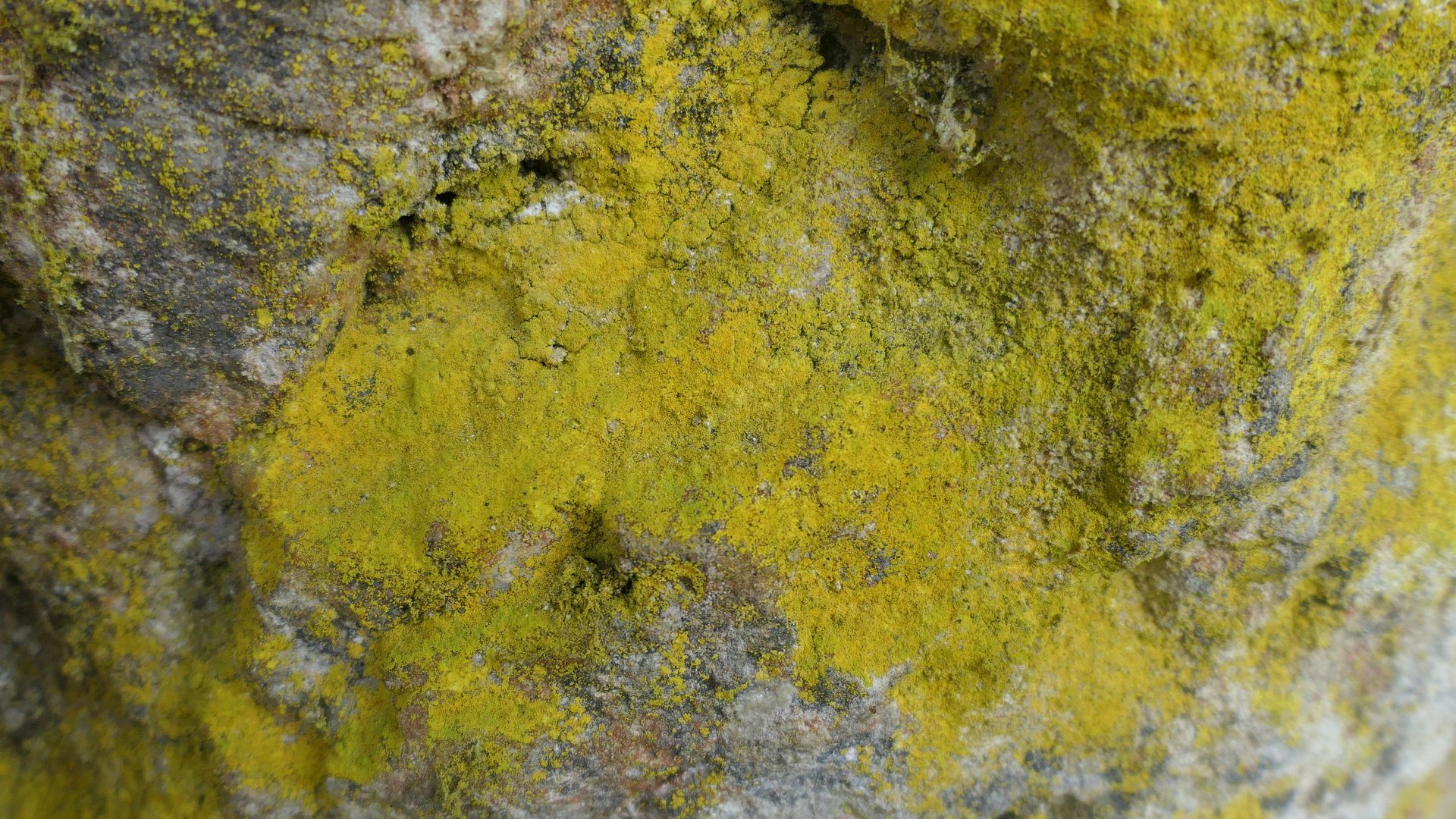 In den regengeschützeten Nischen und Höhlungen im Dolomitgestein leuchtet eine sterile gelbe Flechte.