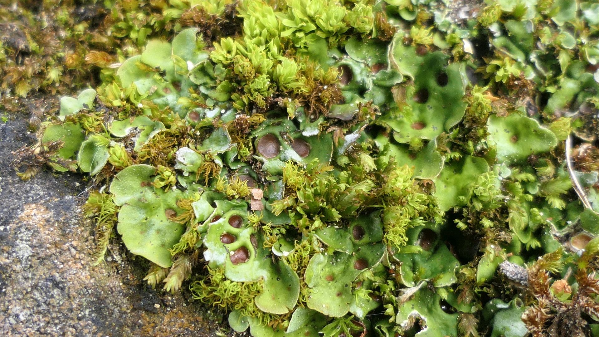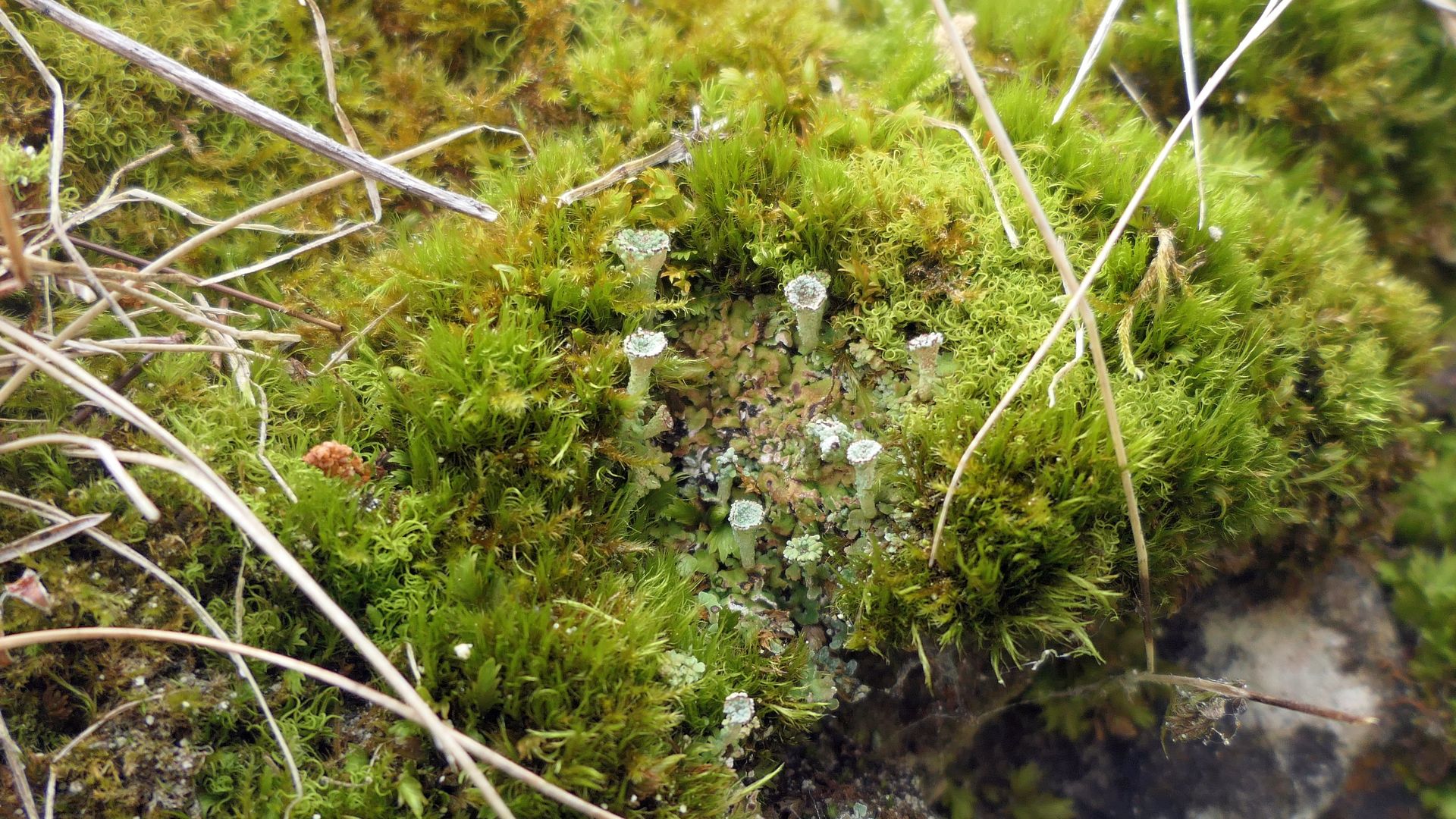 Zwischen den Moosen wächst Caldonia pyxidata pocillum mit den dichtschließenden Grundschuppenrosetten und den kleinen, körnigen Bechern