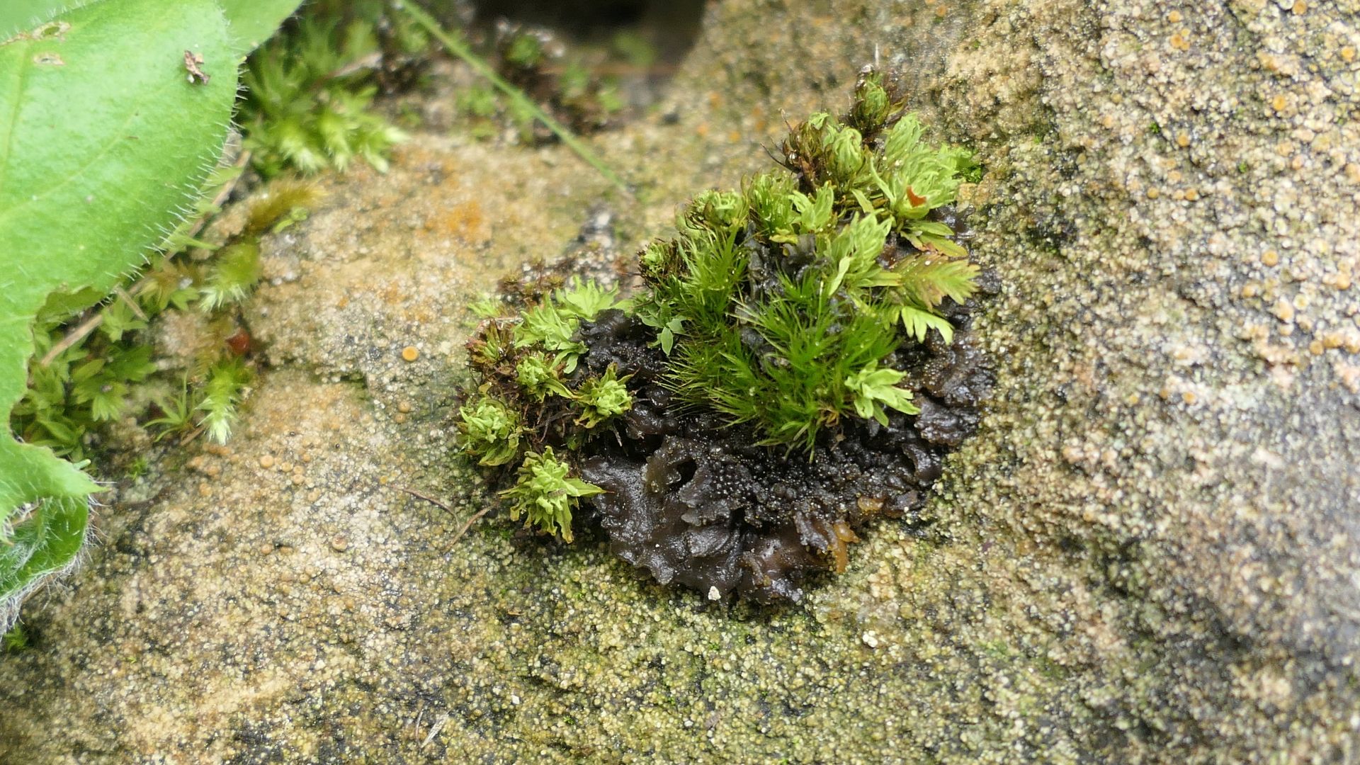 Bild 9a Collema/Lathagrium auriforme kommt über basischem Gesteinen auf Moos vor.