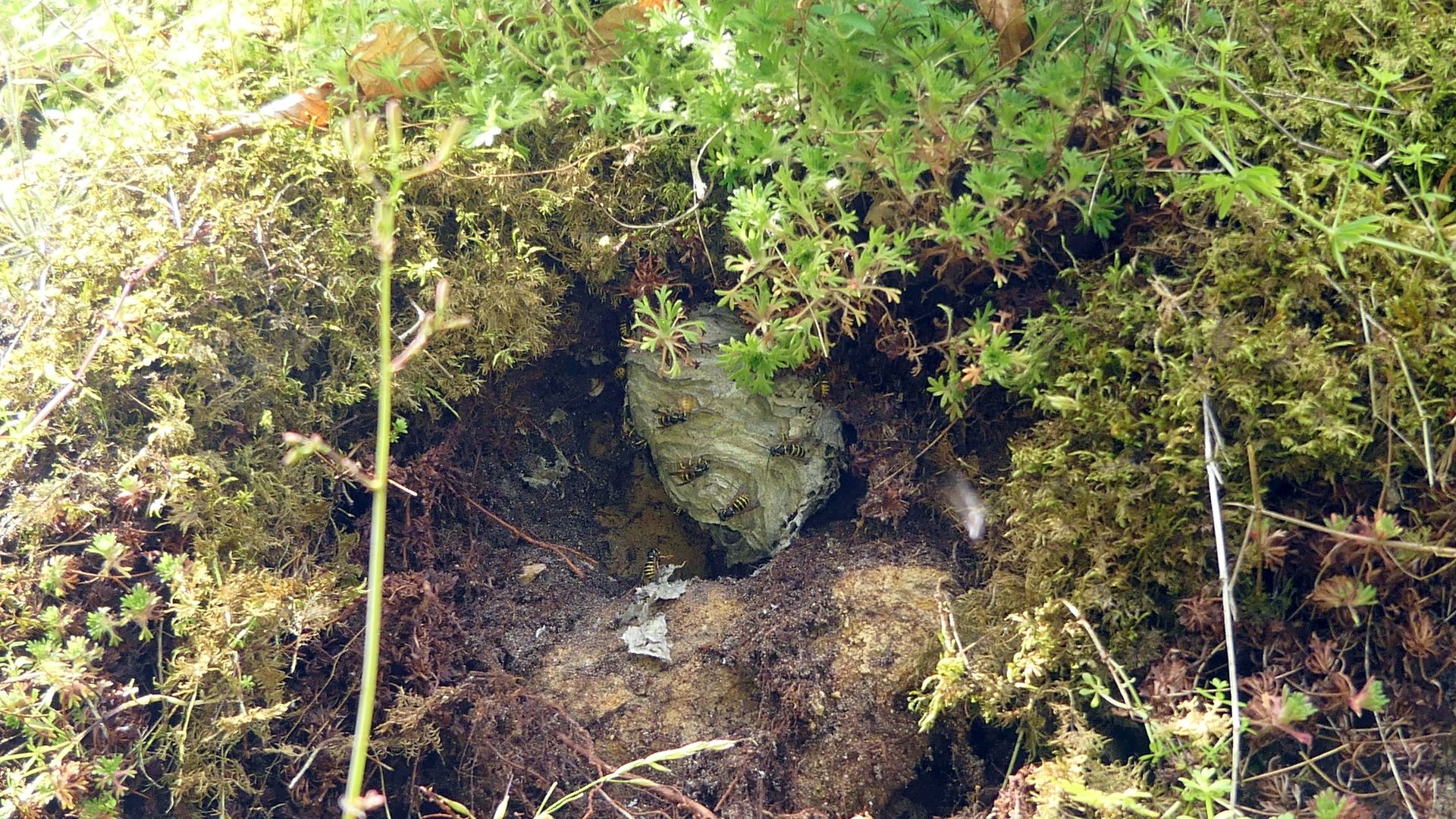 Zwischen dem Moos lässt sich allerhand finden, wie ein verstecktes Wespennest.