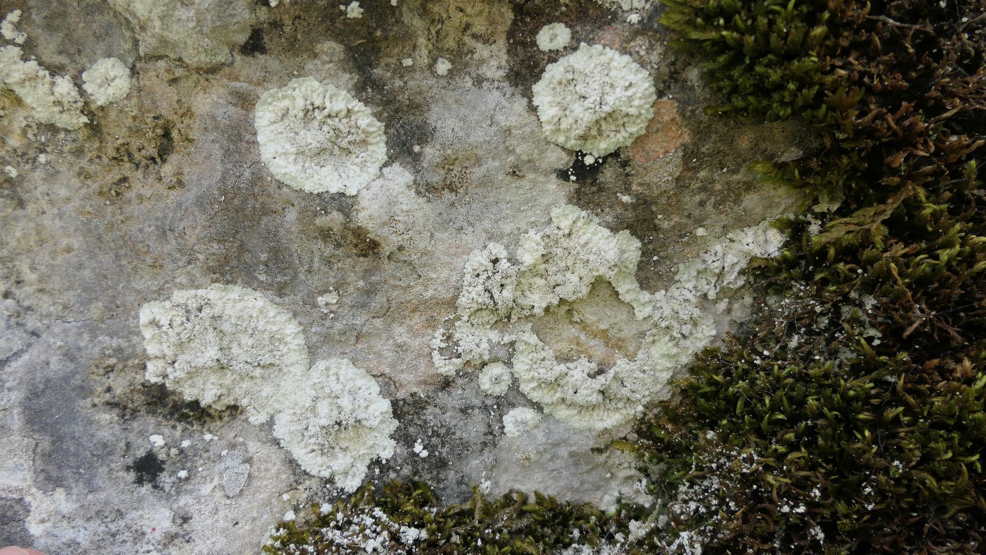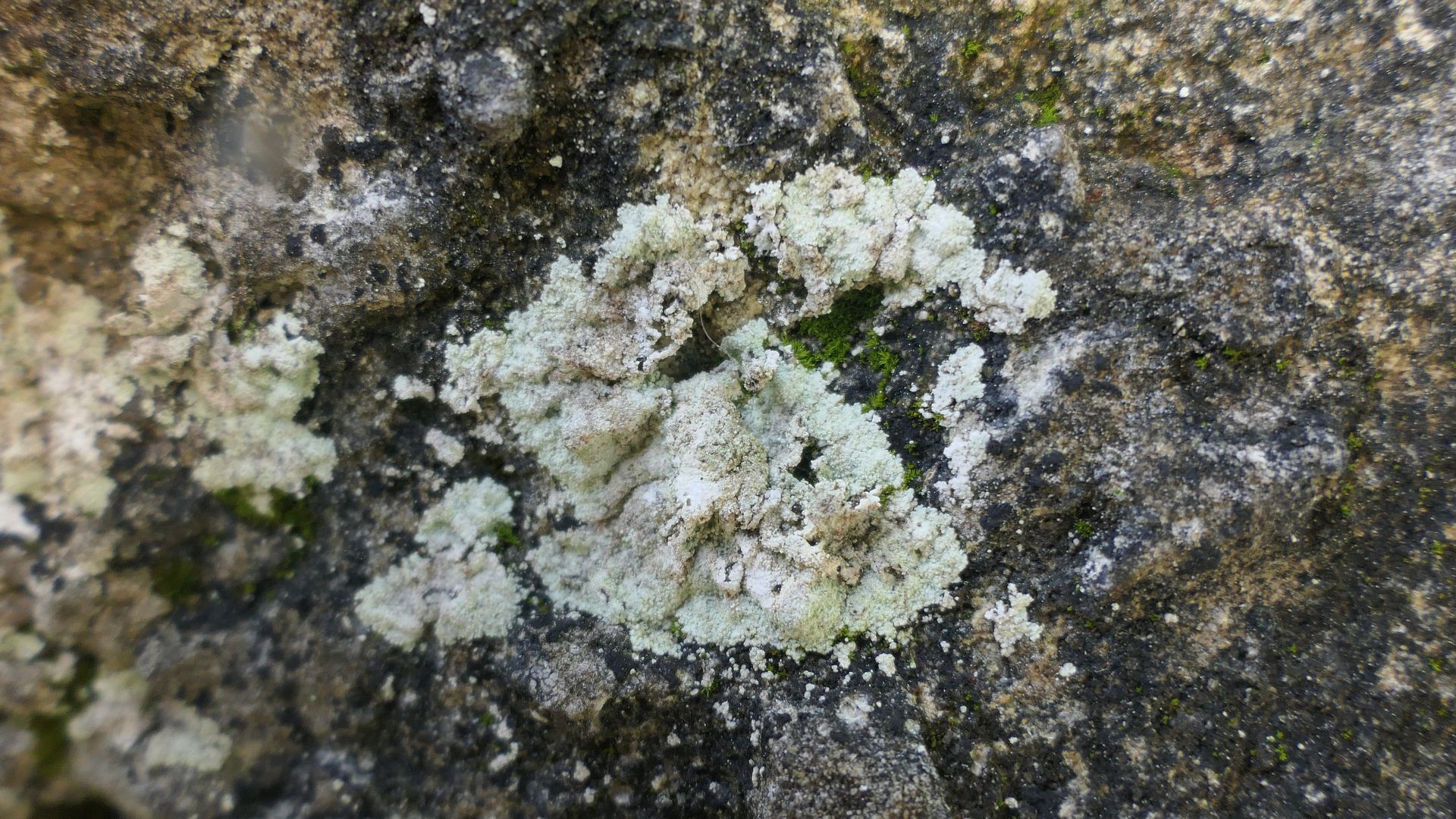 Bild 16a Häutige Lepraria mit löchriger, sich vom Substrat lösender Thallusmitte.
