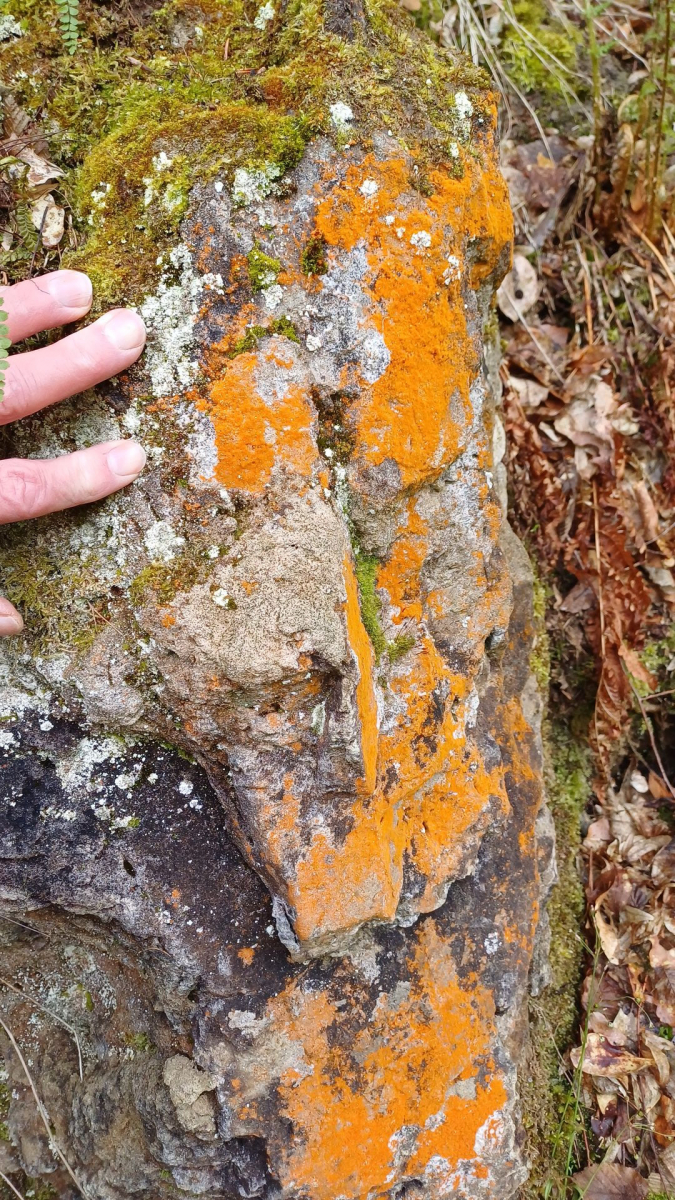 Bild 10a Auf die Jenaer Grubenflechte (Gyalecta jenensis) mit den orangen Apothecien und dem weißlich gerieften Rand und mauerförmigen Sporen trifft man hier überall.
