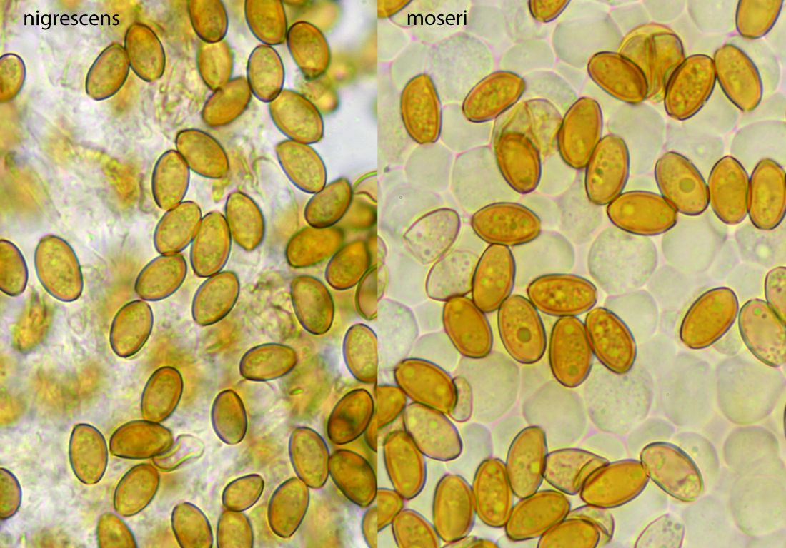 Das ist hier eine heimische Art, die auch gern mal dunklere Farbtöne hat, aber nicht schwärzt wie nigrescens, zudem sind die Sporen deutlicher dickwandig und im Durchschnitt 1-2 µm größer. Die Kaulos sind noch etwas anders geformt, aber beide Arten haben nicht-lecythiforme Kaulos und Cheilos mit kleinen Köpfchen bis 3-4 µm Durchmesser.
