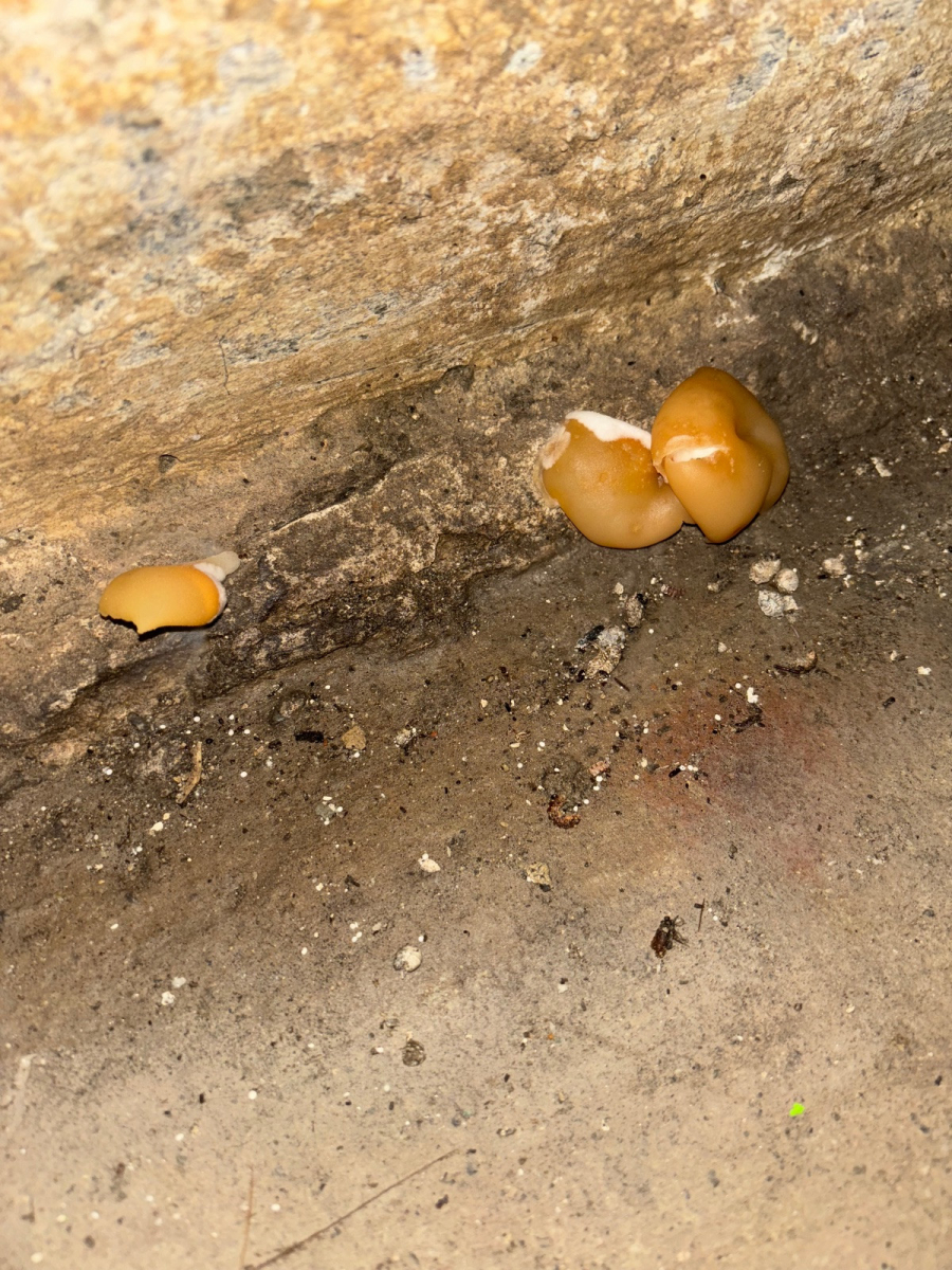 Der Pilz ist aus der Wand/ dem Boden gewachsen.