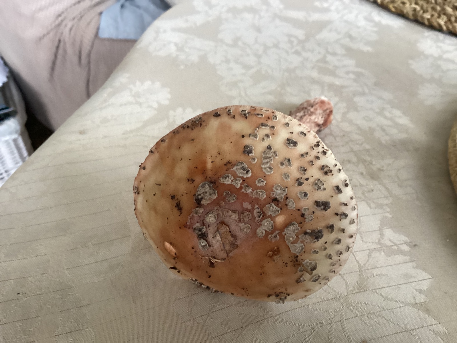 Wie läßt sich die Huthaut abziehen, bei Amanita oft so wie Tortenstückchen, beim Perlpilz ists drunter auch rötlich bis rotbräunlich, kann aber auch erst kaum sein, das kommt dann binnen ein paar Minuten so rosalich zuerst, wird dann oft etwas dunkler mit der Zeit.
