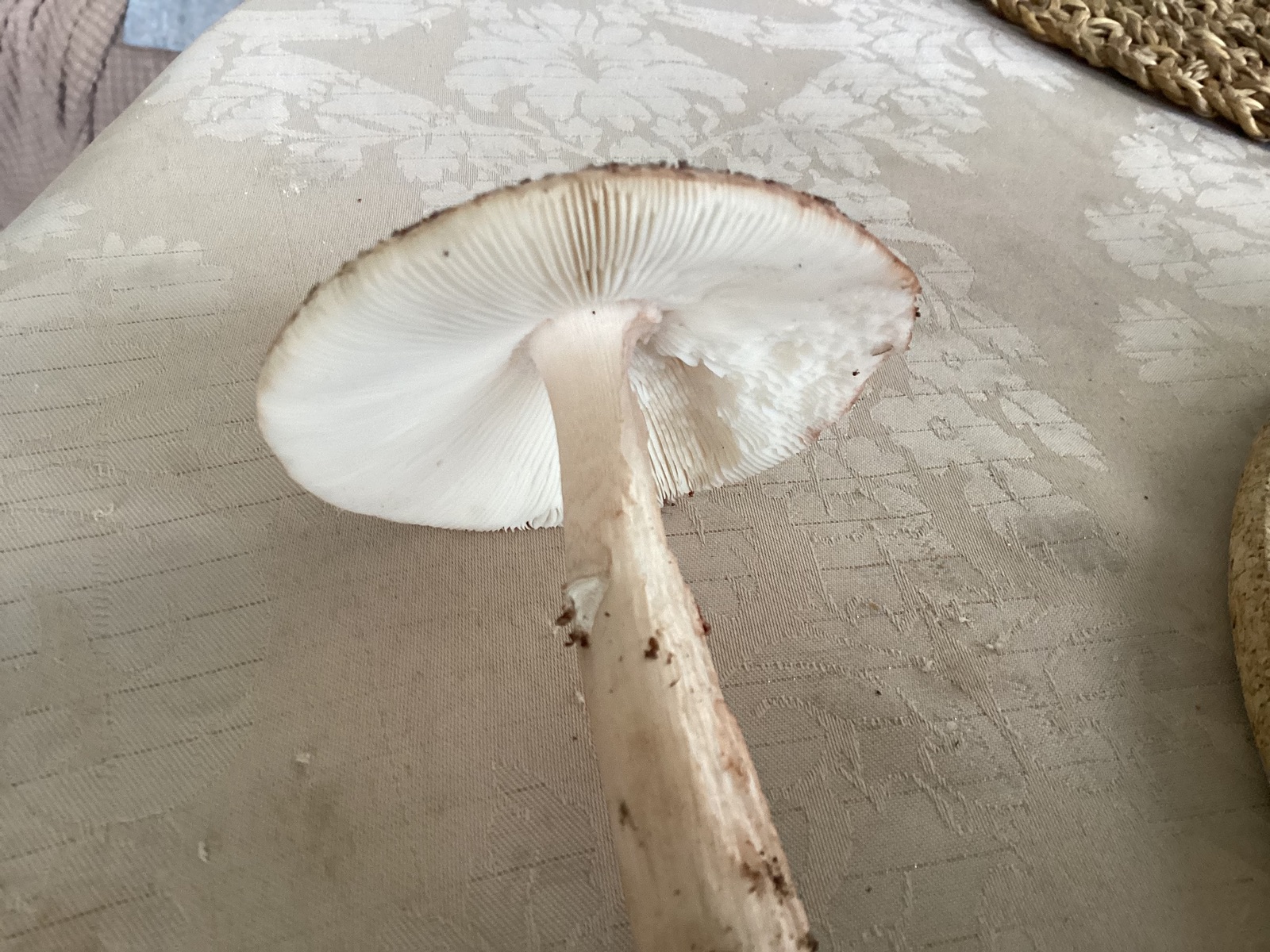 Wie läßt sich die Huthaut abziehen, bei Amanita oft so wie Tortenstückchen, beim Perlpilz ists drunter auch rötlich bis rotbräunlich, kann aber auch erst kaum sein, das kommt dann binnen ein paar Minuten so rosalich zuerst, wird dann oft etwas dunkler mit der Zeit.