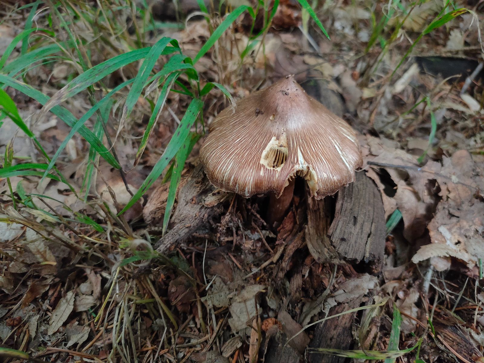 5. Ein Inocybe, am Wegesrand in Buchennähe, im Kalkgebiet auf lehmhaltigem Boden gefunden. Sehr spitzkegelig und der FK hat ordentlich unangenehmen gerochen. Auffallend ist das dünne Hutfleisch und der rotbraune Stiel im oberen Bereich. Dieser wird in an der Stielbasis hohl.