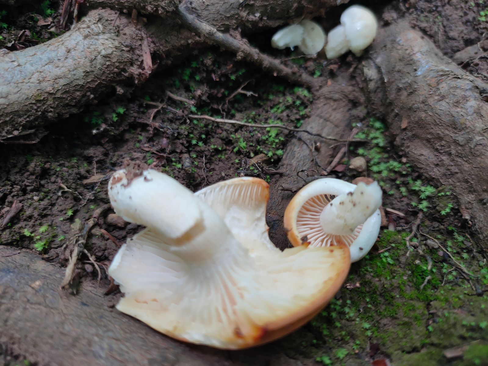6. Ein wurzelnder Rübling auf ebenfalls lehmhaltigem Boden (Kalk). Dieser ist deutlich radial runzelig und mit hellen Schneiden versehen. Es ist von weißem Sporenpulver auszugehen.