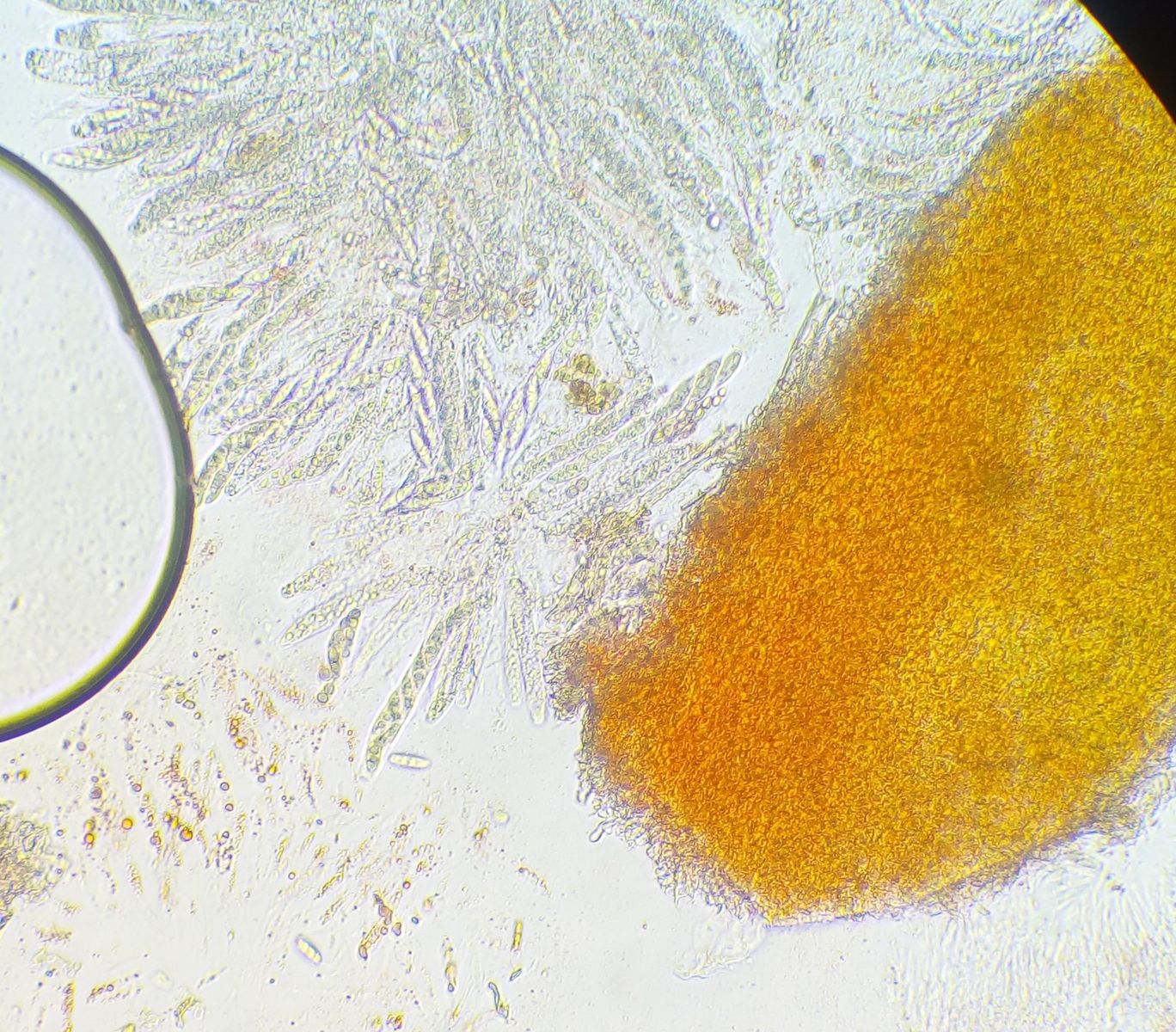 während ich aus dem orangen Zeug nicht schlau werde, ist der Rest ein Asco mit Schläuchen zu 8 Sporen, die Ascos mit ausgebildeten Sporen sind 70-105 µm lang, mit Sporen bis zu 20 µm lang