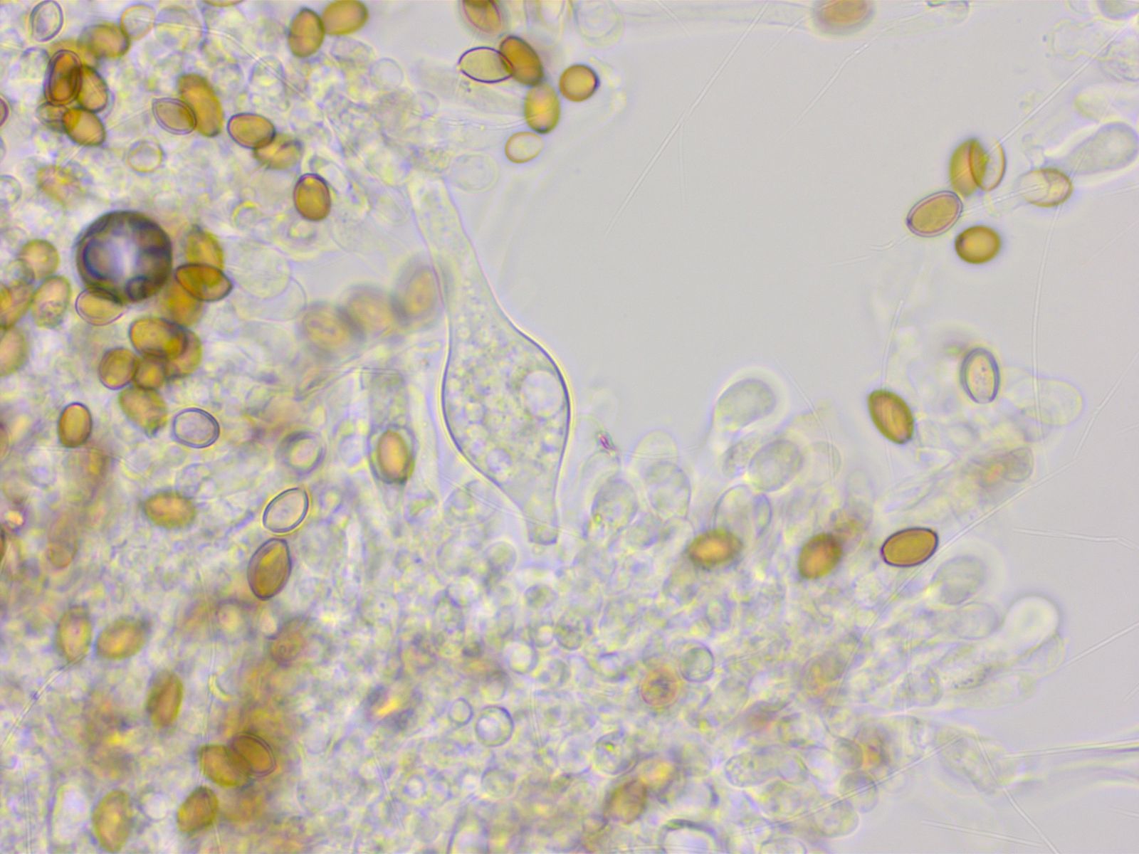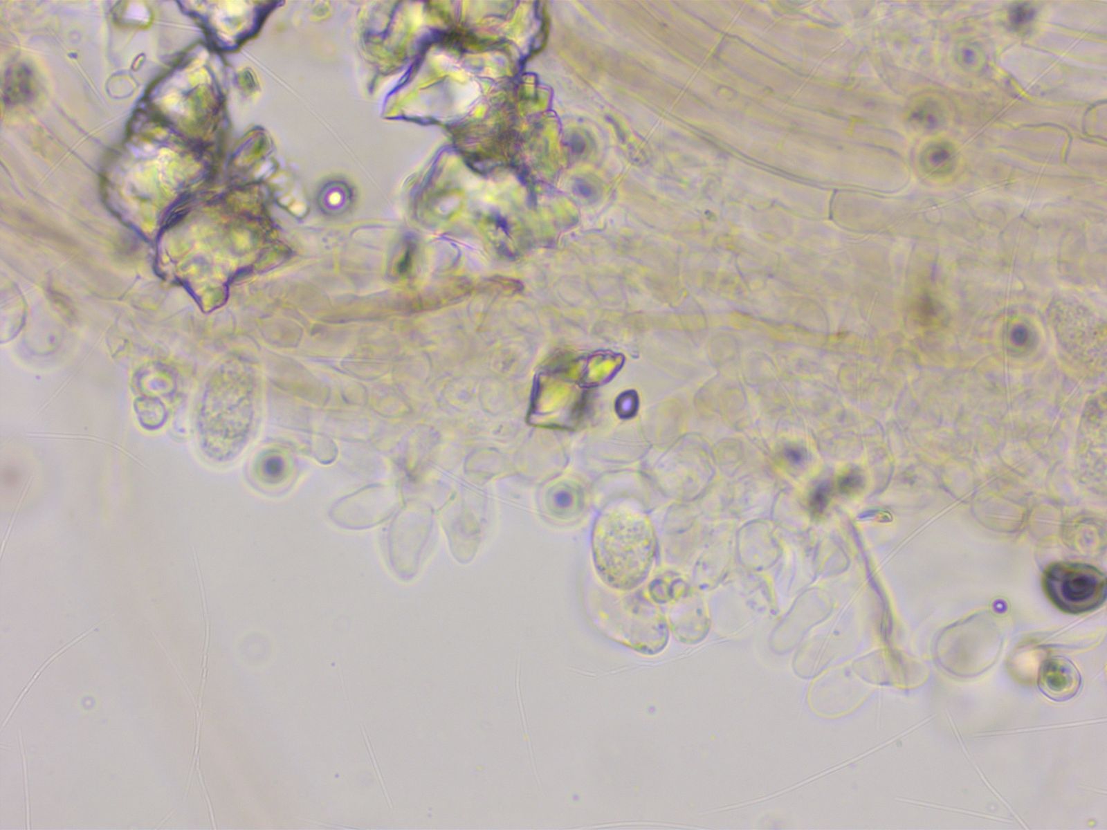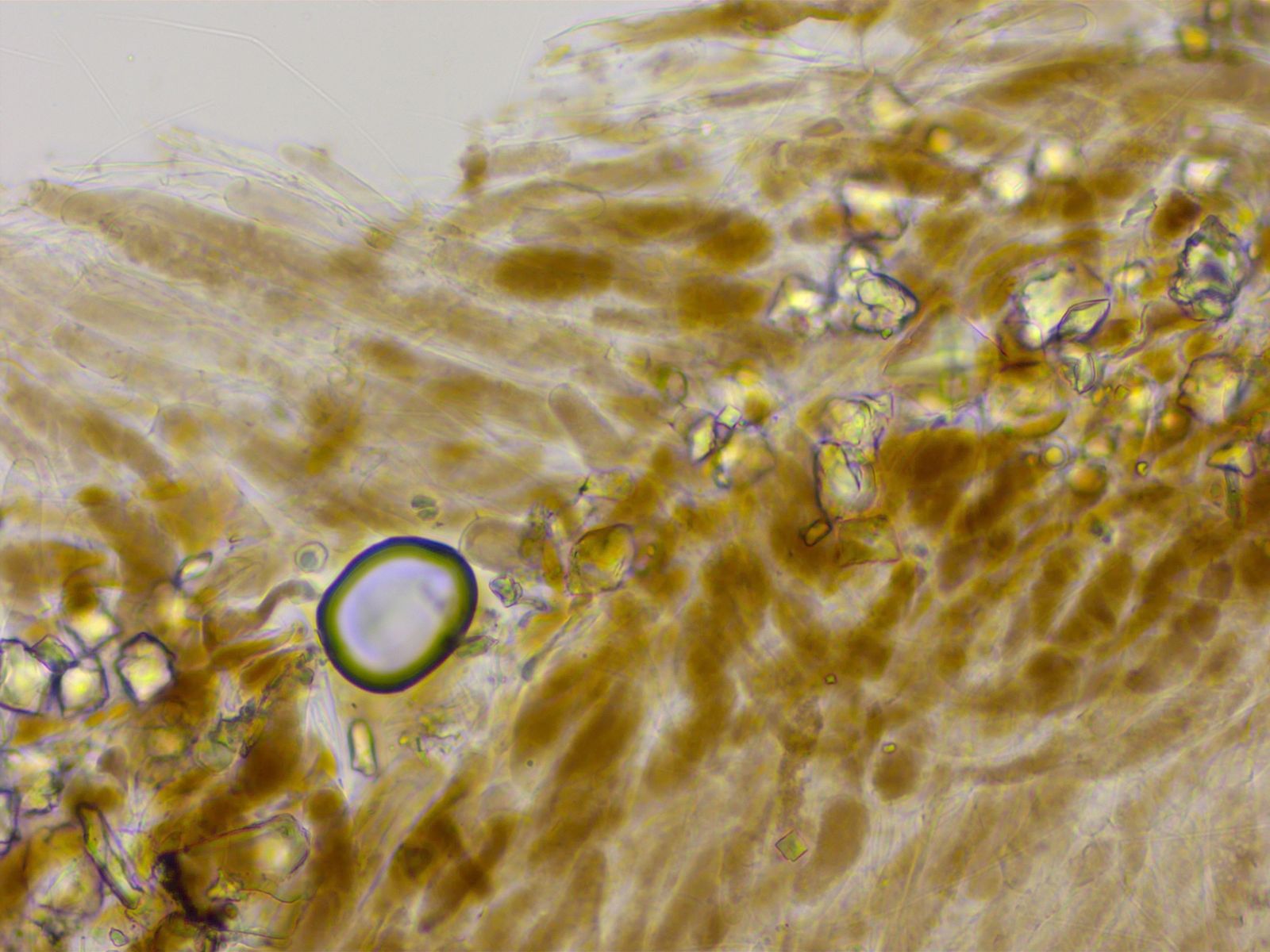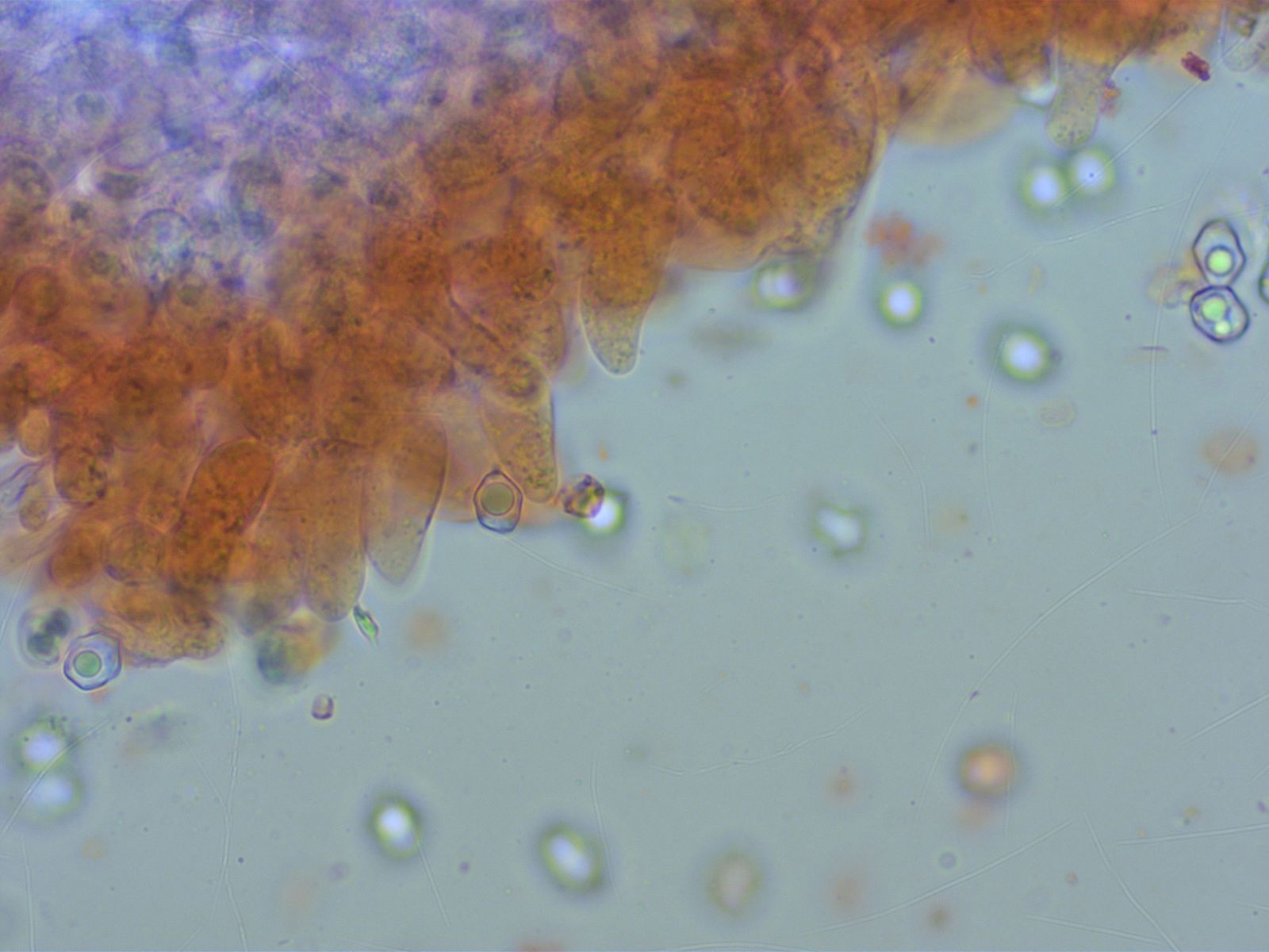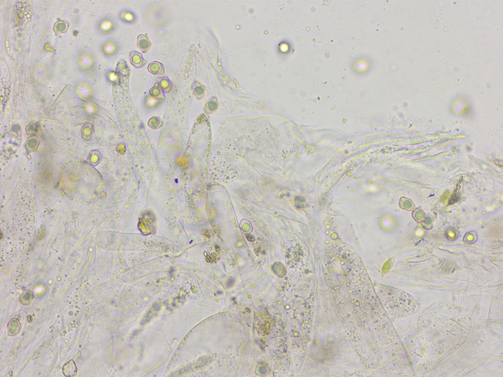 Von den eher spärlichen, keuligen Zystiden habe ich nur dieses Foto, für das ich mich jetzt schäme.