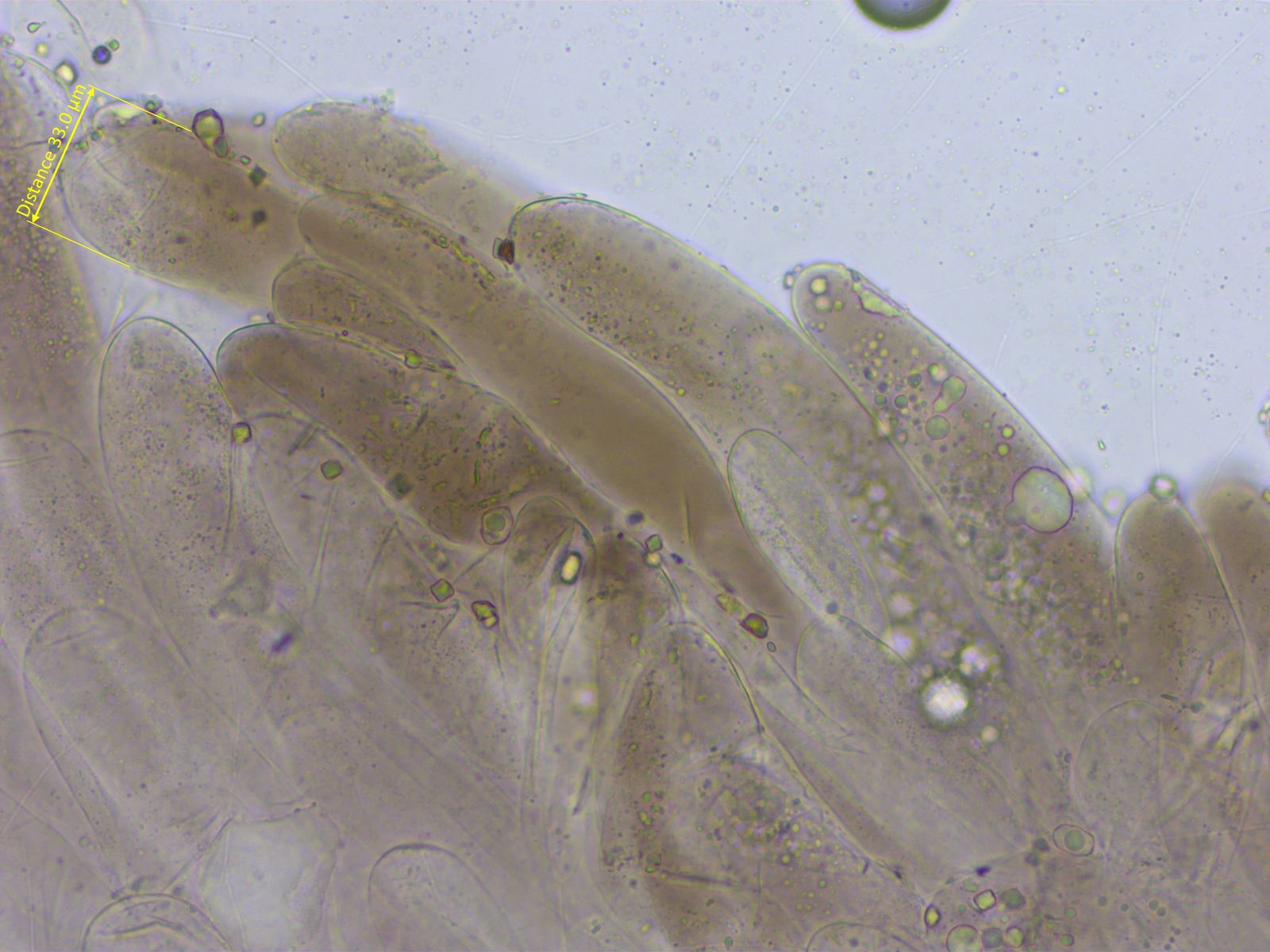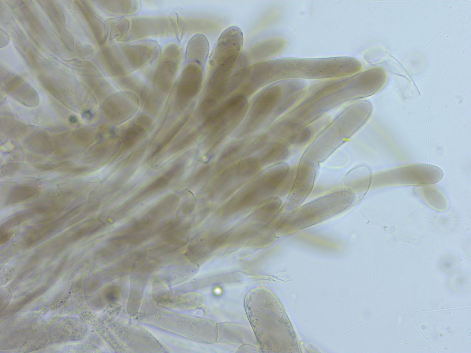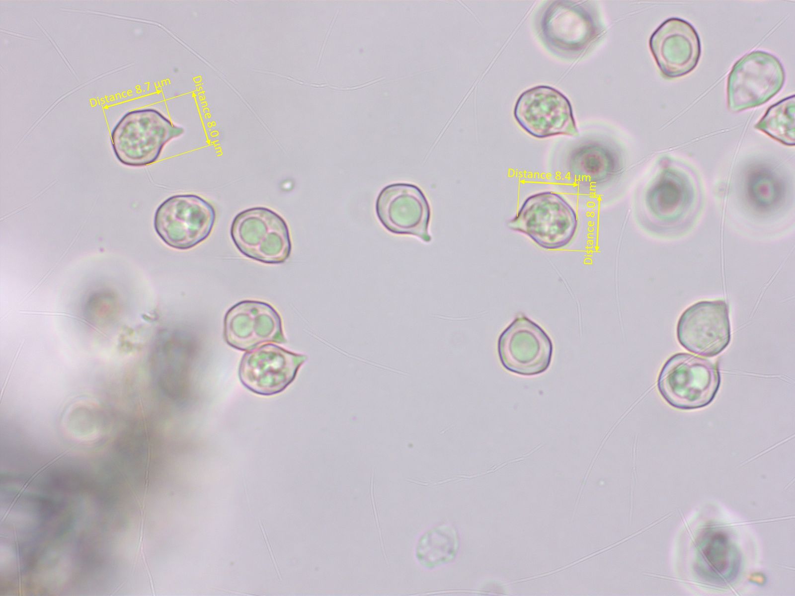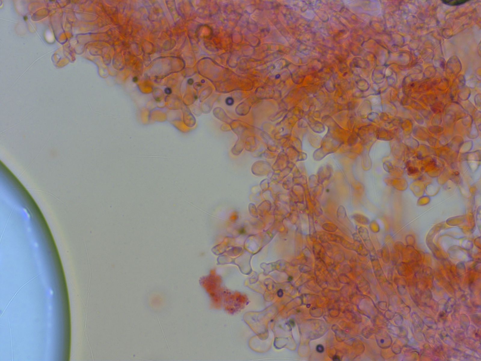 Von den eher spärlichen, keuligen Zystiden habe ich nur dieses Foto, für das ich mich jetzt schäme.