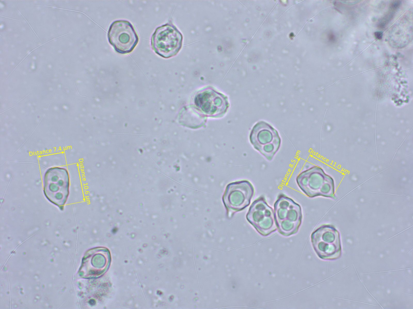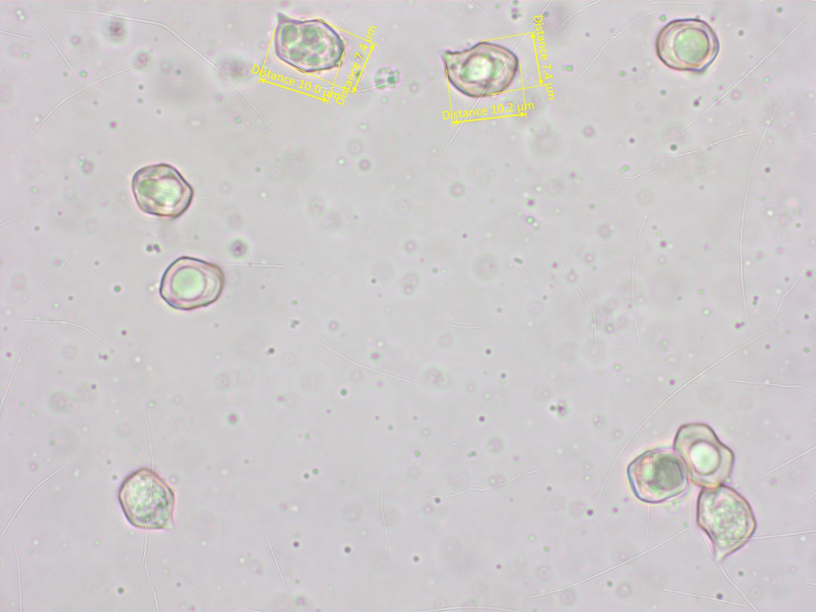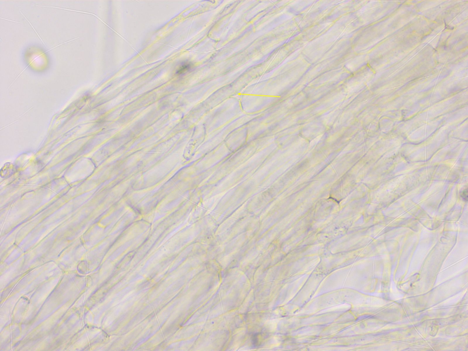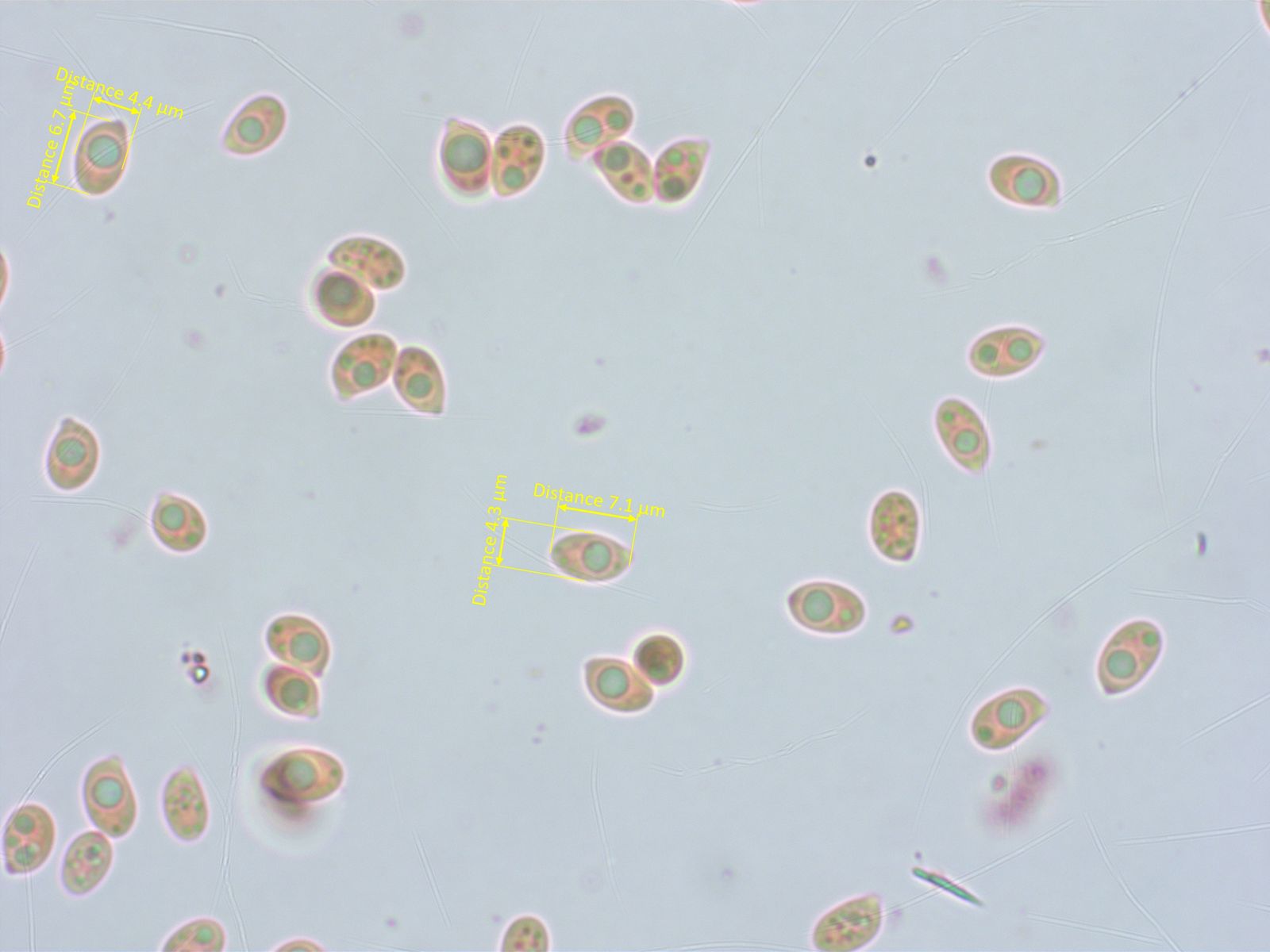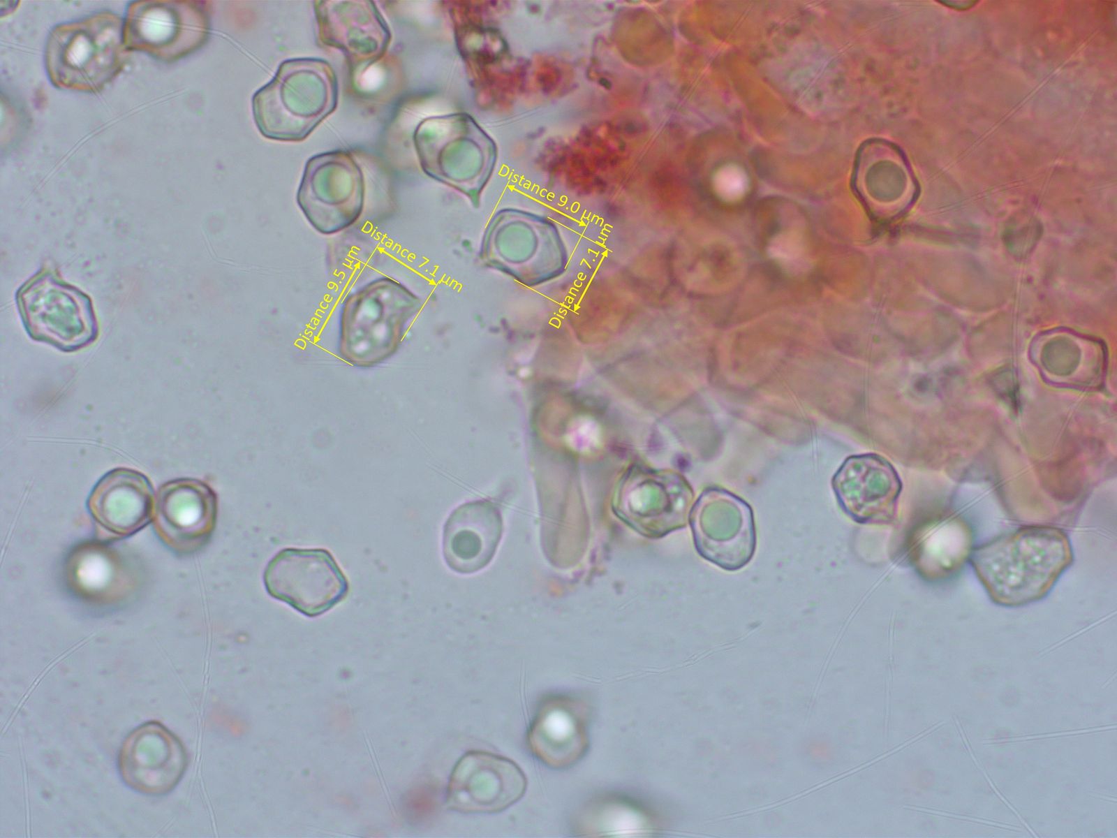 Von den eher spärlichen, keuligen Zystiden habe ich nur dieses Foto, für das ich mich jetzt schäme.