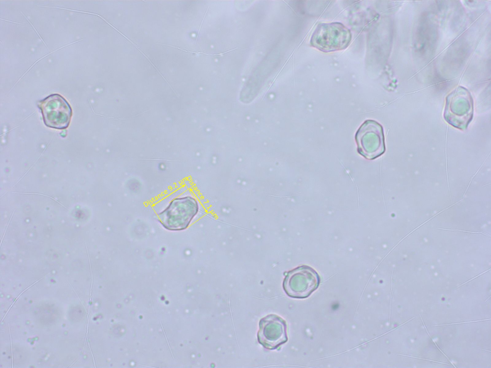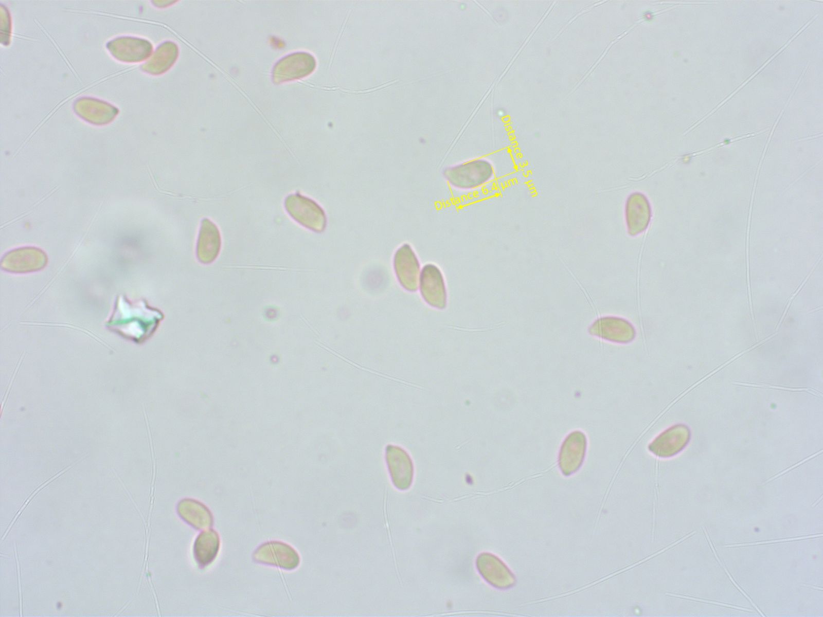 Die Sporen sind breit tropfenförmig, was schon viele Arten ausschliesst.