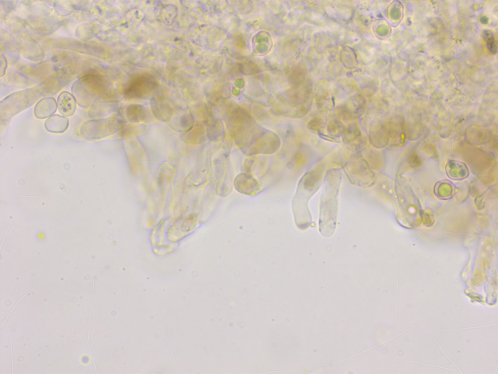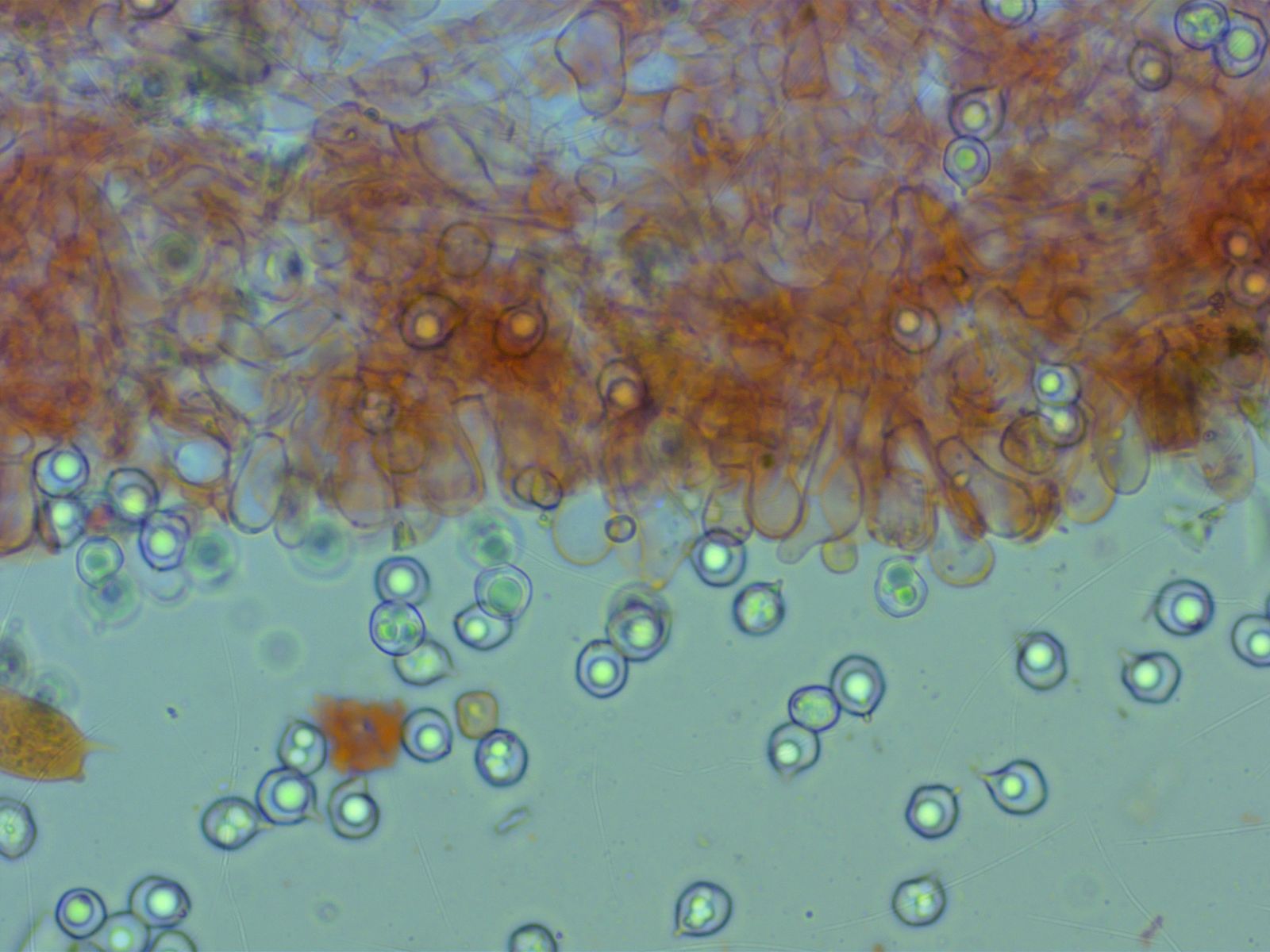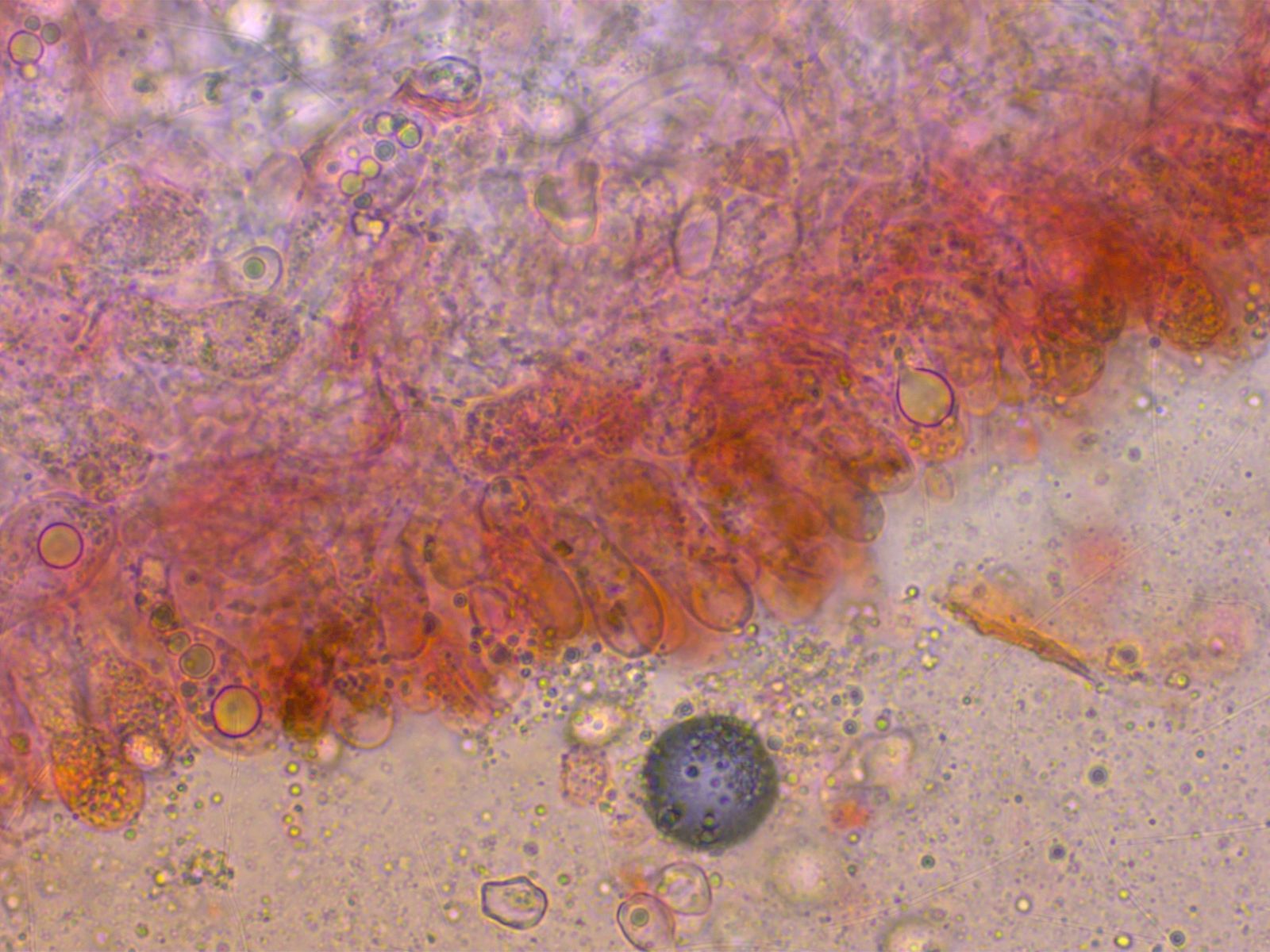 Die keuligen Cheilozystiden sind ganz schwach pigmentiert. Mit der Lupe findet man auch einzelte dunkel Stellen an der Lamellenschneide.