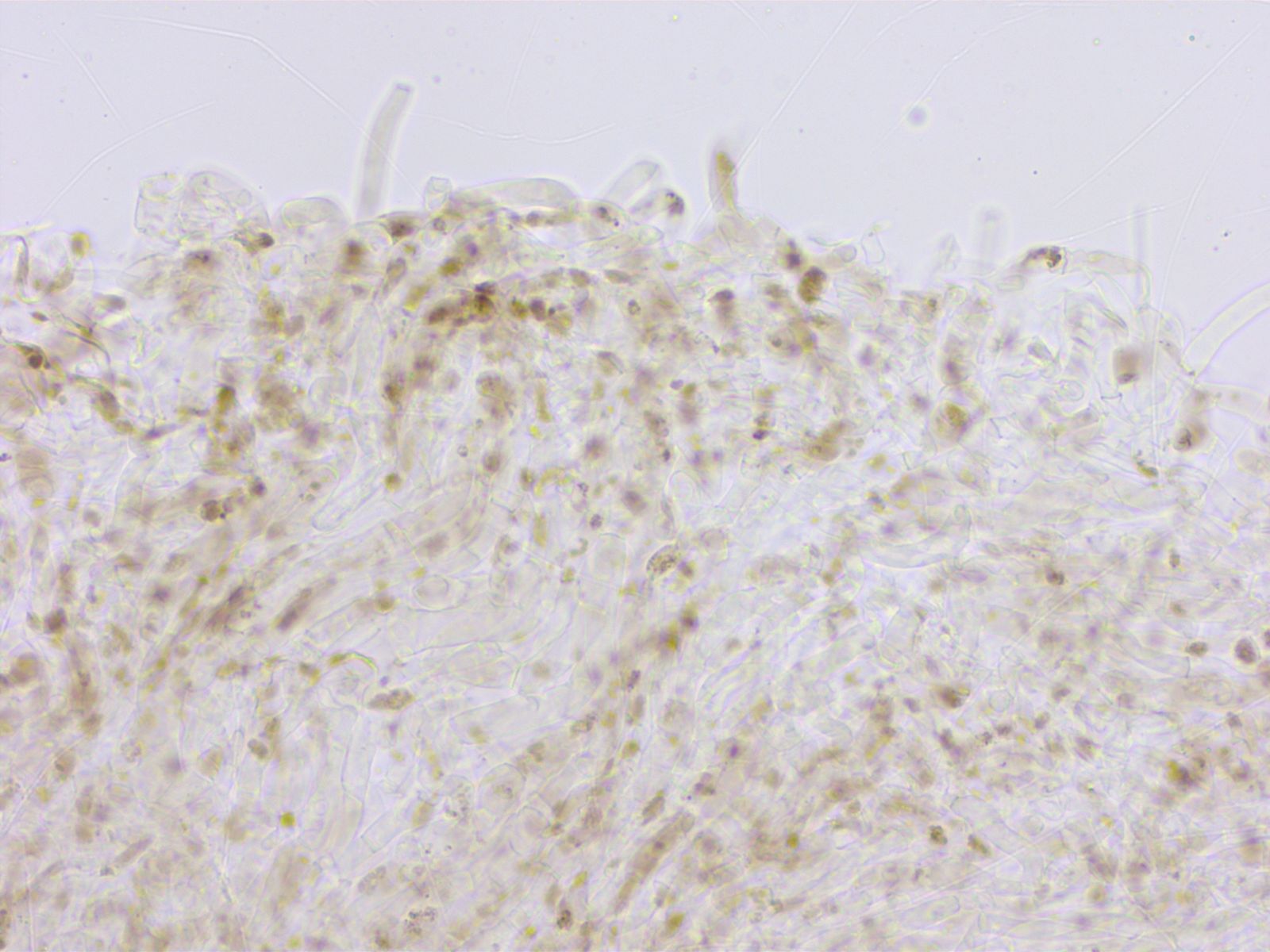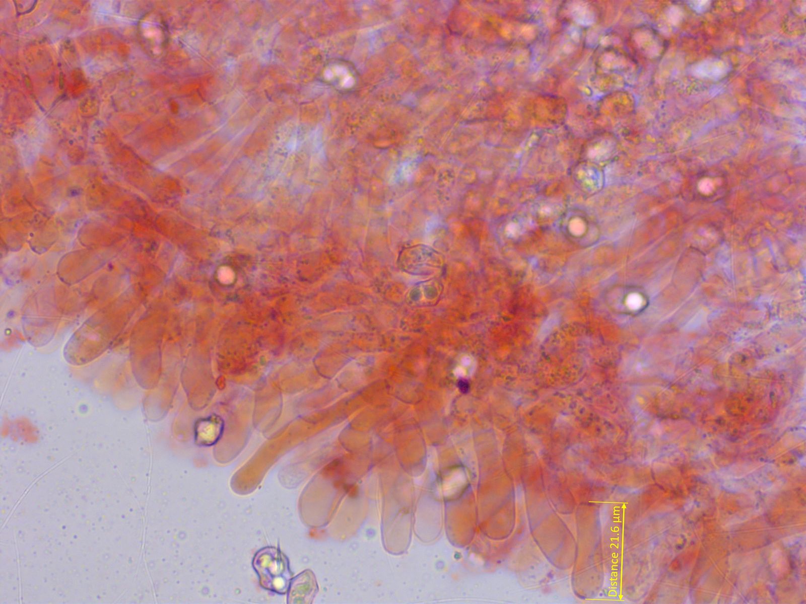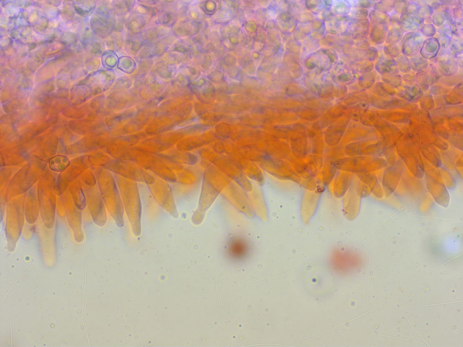 Die keuligen Cheilozystiden sind ganz schwach pigmentiert. Mit der Lupe findet man auch einzelte dunkel Stellen an der Lamellenschneide.