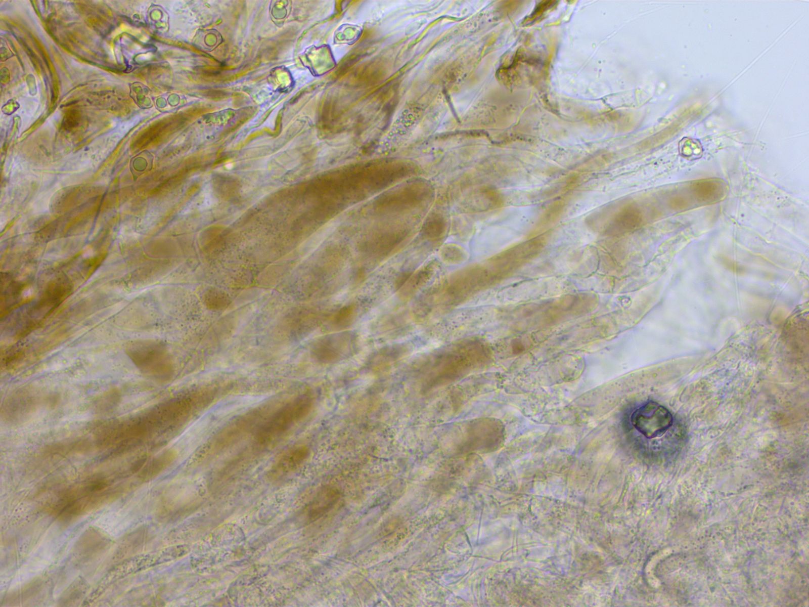 Von den eher spärlichen, keuligen Zystiden habe ich nur dieses Foto, für das ich mich jetzt schäme.
