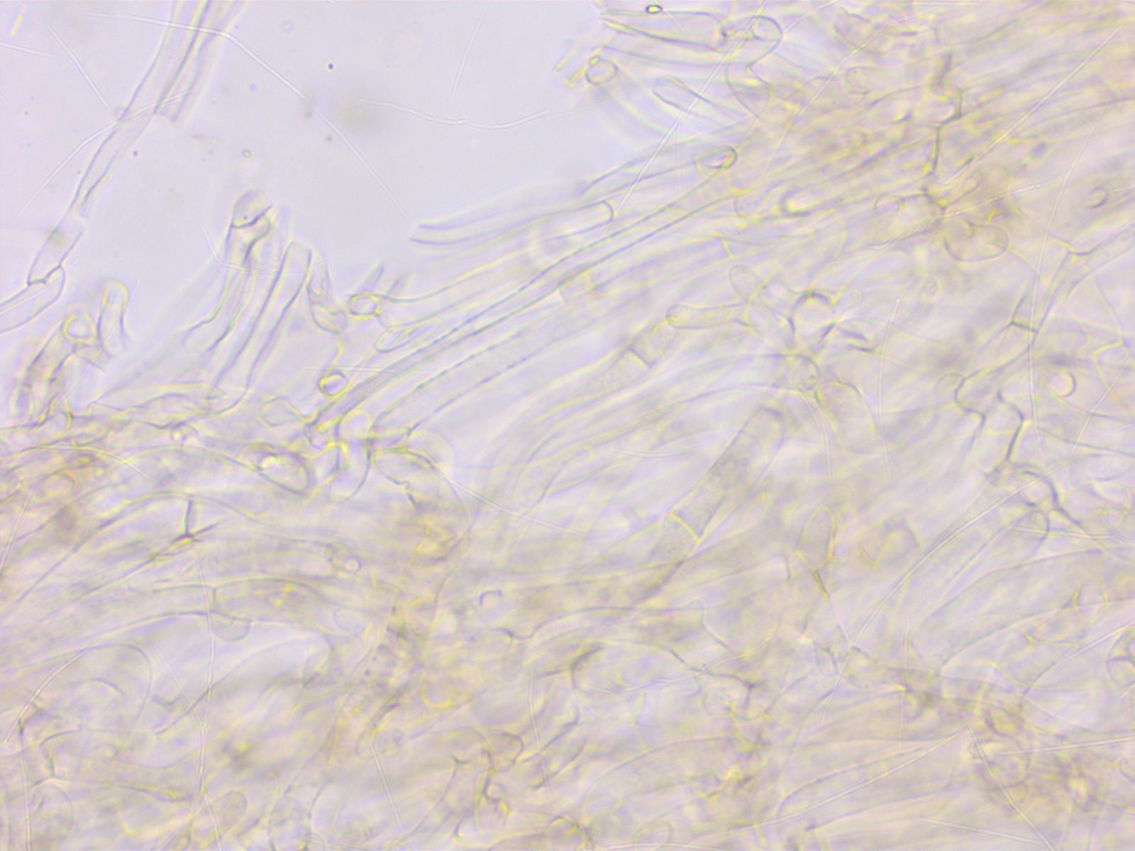 Von den eher spärlichen, keuligen Zystiden habe ich nur dieses Foto, für das ich mich jetzt schäme.