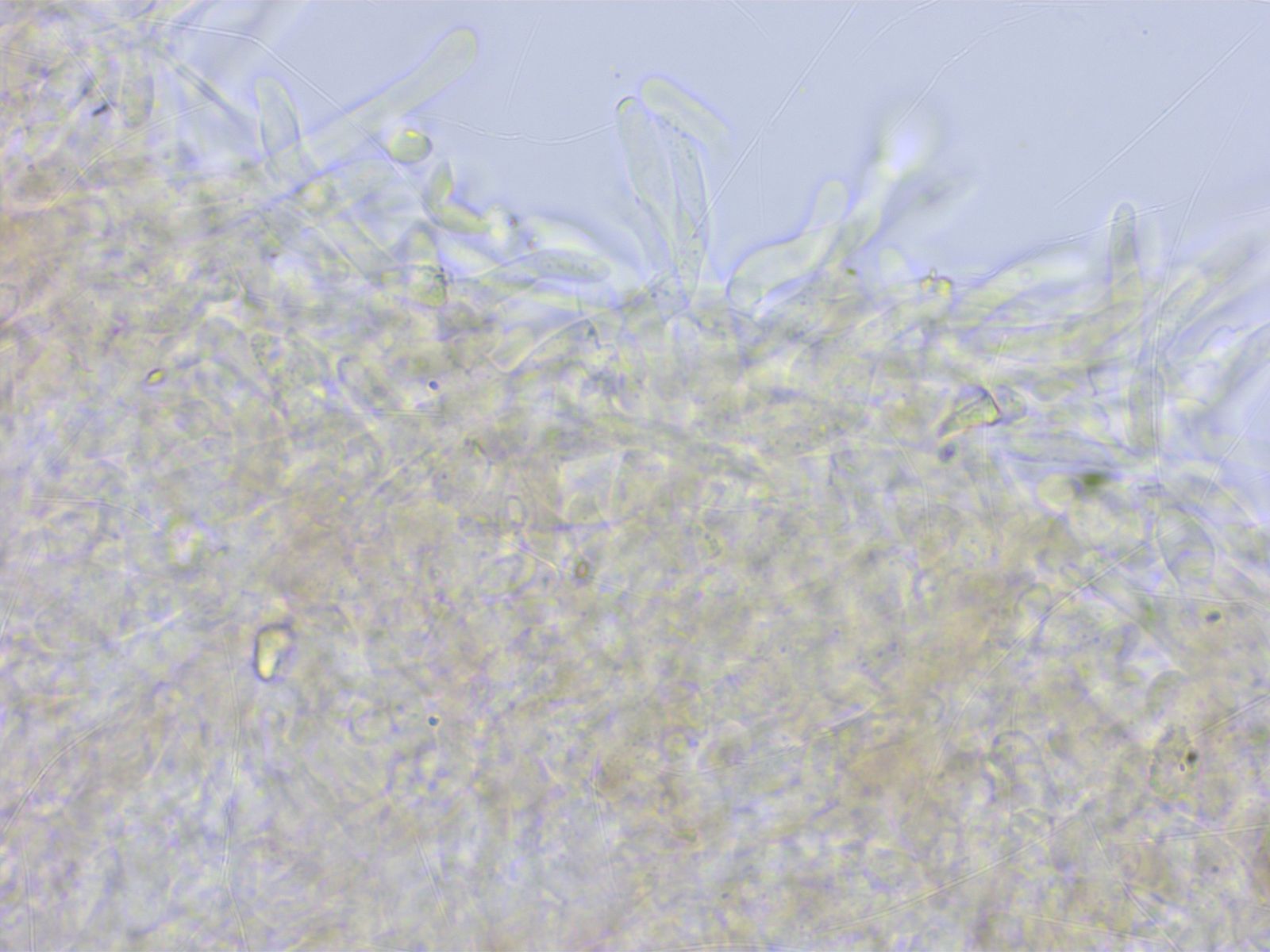 Die keuligen Cheilozystiden sind ganz schwach pigmentiert. Mit der Lupe findet man auch einzelte dunkel Stellen an der Lamellenschneide.