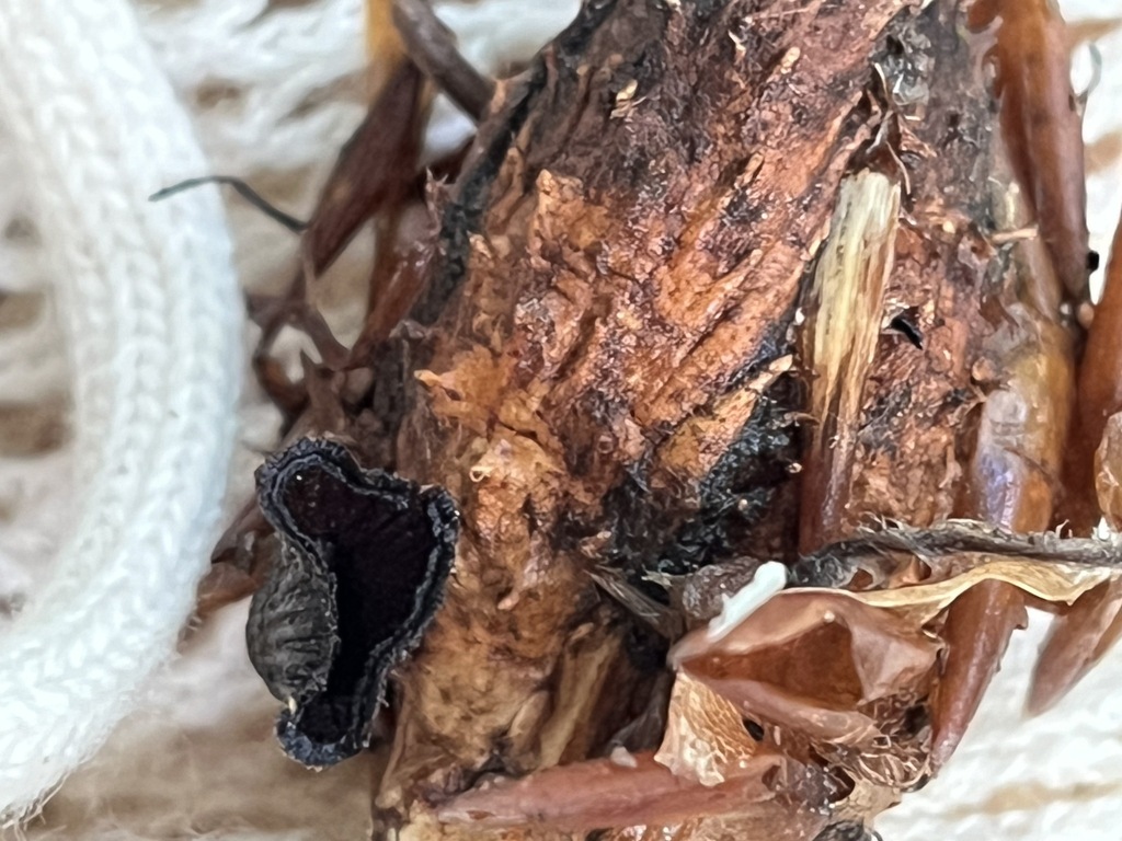 Die dritte Art dürfte wieder etwas aus dem Dunstkreis der Helmlingsverwandschaft sein. Substrat ist eine abgestorbene, aber noch stehende Fichte (oder das Moos an jener Fichte). Die Art weist ein büscheliges Wachstum auf.