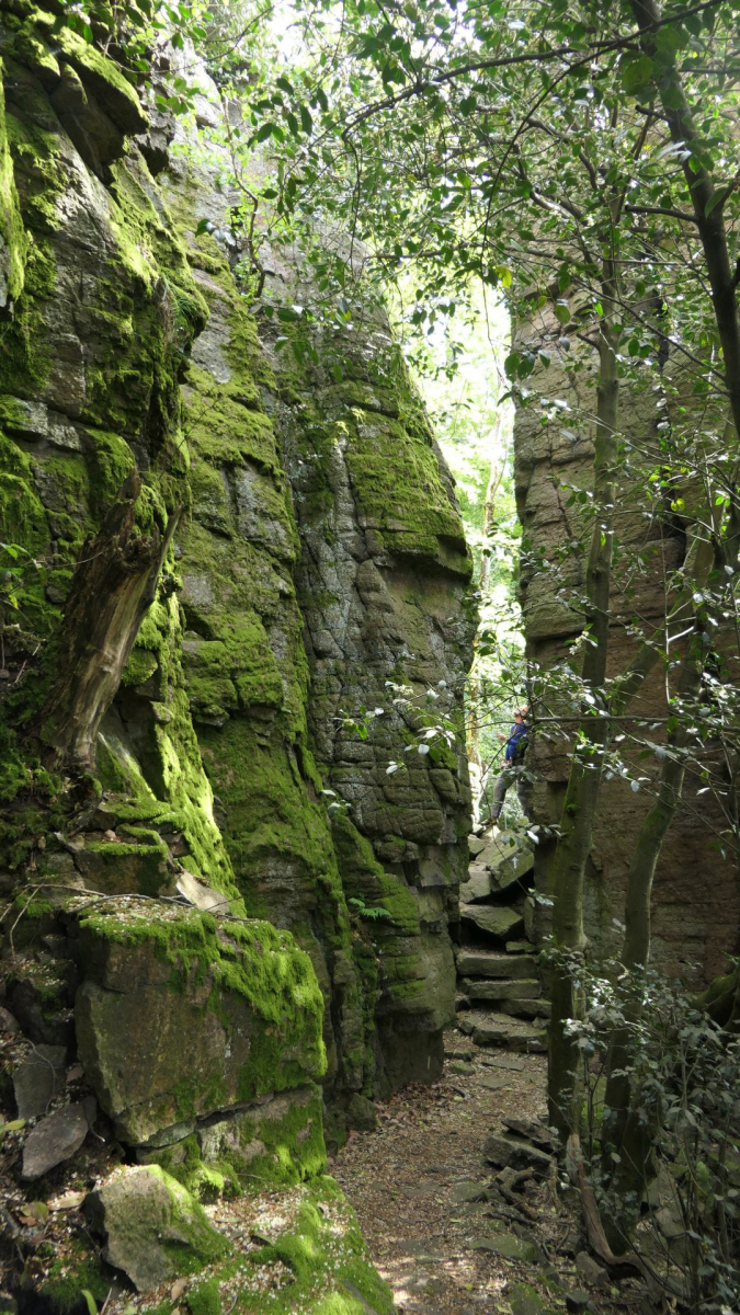 Die freiliegenden Steinoberflächen an den Blöcken und Felswänden sind eindrucksvoll bewachsen.