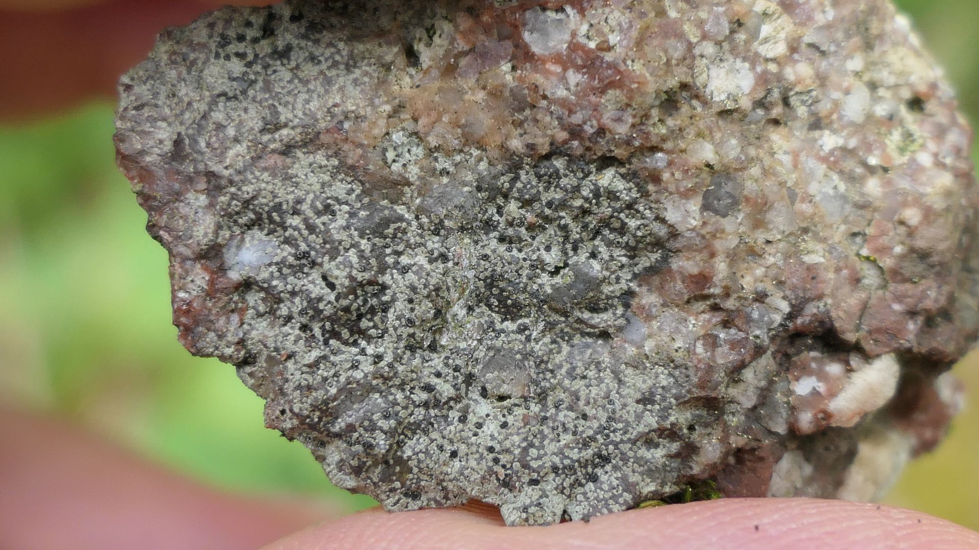 Bild 3 Steinchen zwischen den Fingern gehalten mit Rinodina oxydata.
