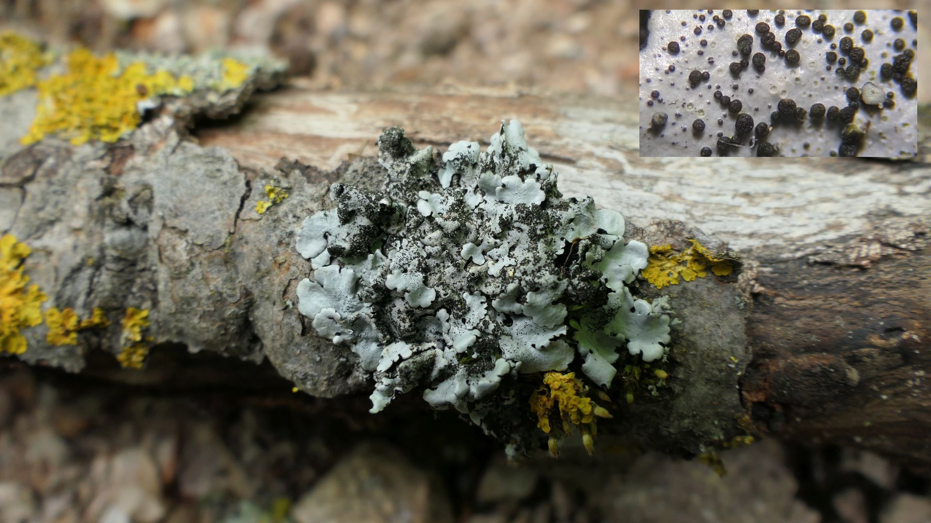 Bild 7 Parmelina pastillifera mit den typisch schwarzen, knopfförmigen Isidien auf der Thallusoberfläche