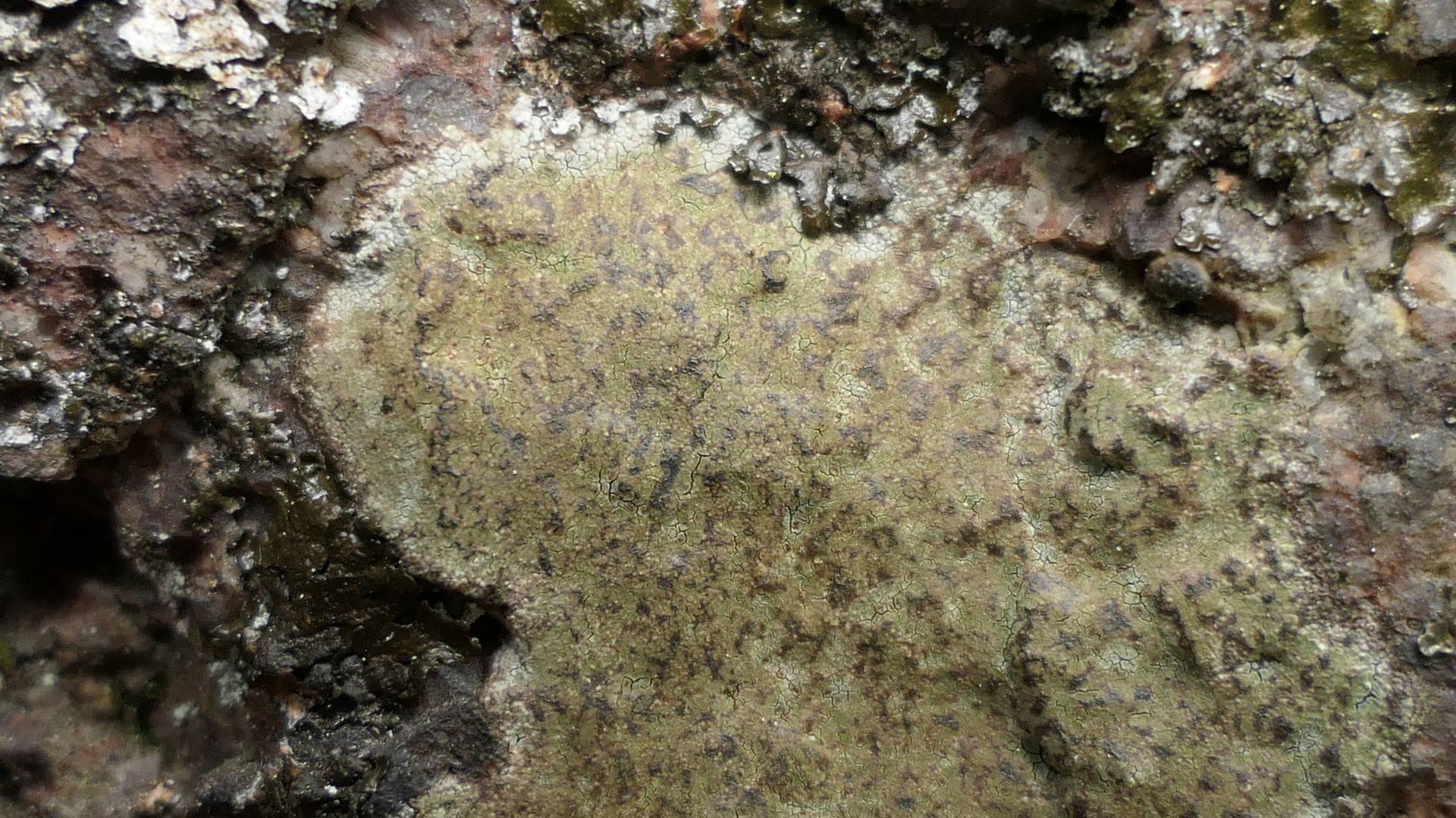 Bild 12 Fuscidea canthoides an sauren, senkrechten Gesteinsflächen bildet schöne Mosaike, die einzelnen Lager durch dunklen Vorthallus getrennt.