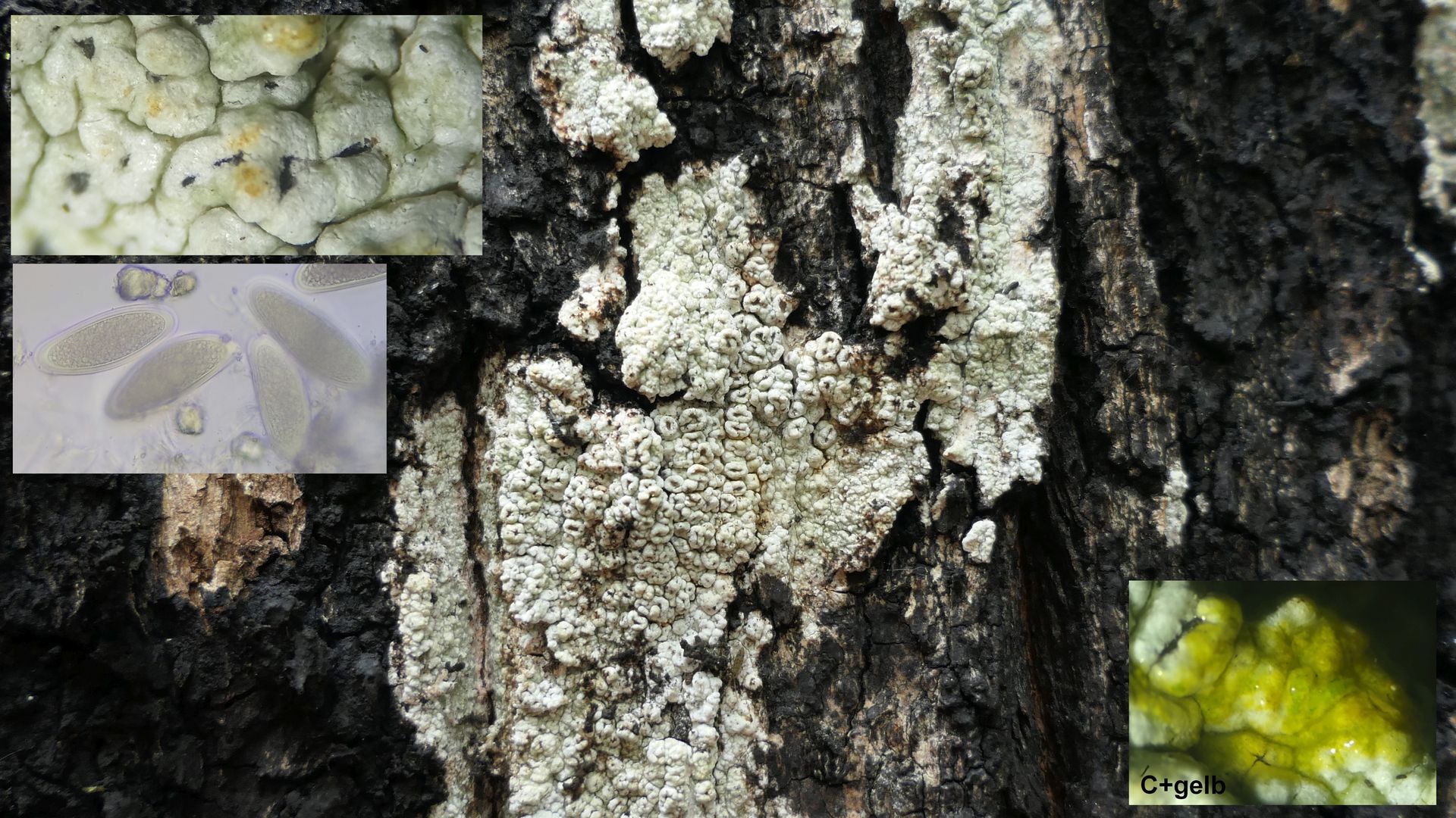 Bild 13 Pertusaria hymenea an Ahornstamm mit einer kräftig gelben C+ Reaktion, Sporengrößen passen.