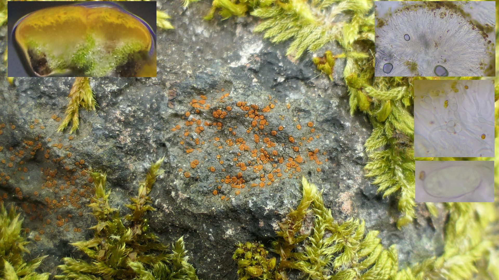 In großer Zahl sind orange Apothecien mit sehr dünnem grünstichigem Lager und schwarzem Vorlager auf den Steinen am Wegesrand finden.