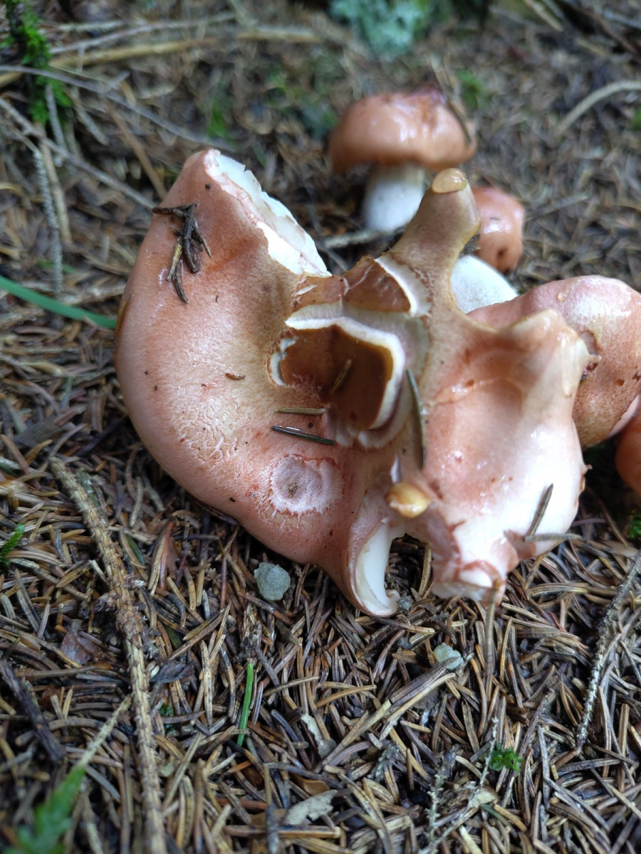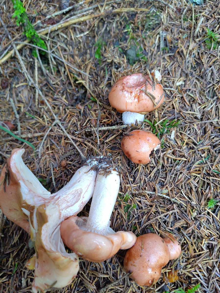 Gefunden habe ich diese grössere Gruppe von Fruchtkörpern (4-9 cm Hutdurchmesser) auf kalkigem Boden im dichten Fichtenwald auf 1250 m im Berner Oberland.