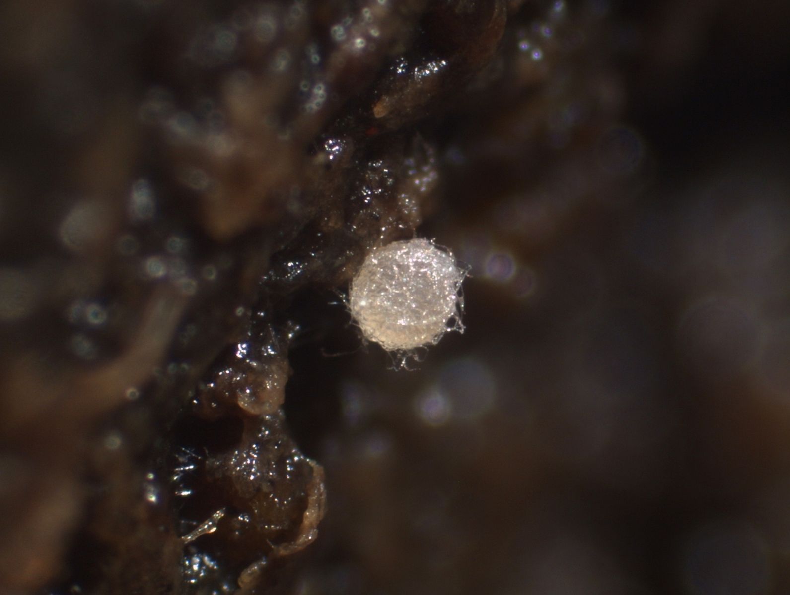 Cleisthotecien rund, jung weißlich, behaart, später bräunlich abdunkelnd und verkahlt, 300-550 µm im Durchmesser.