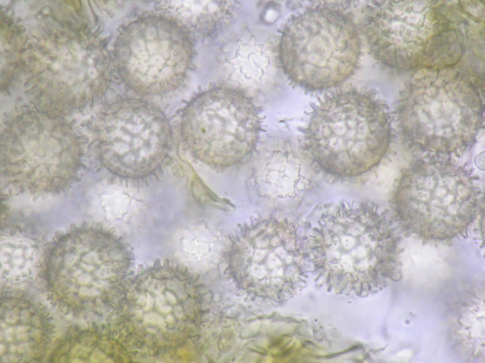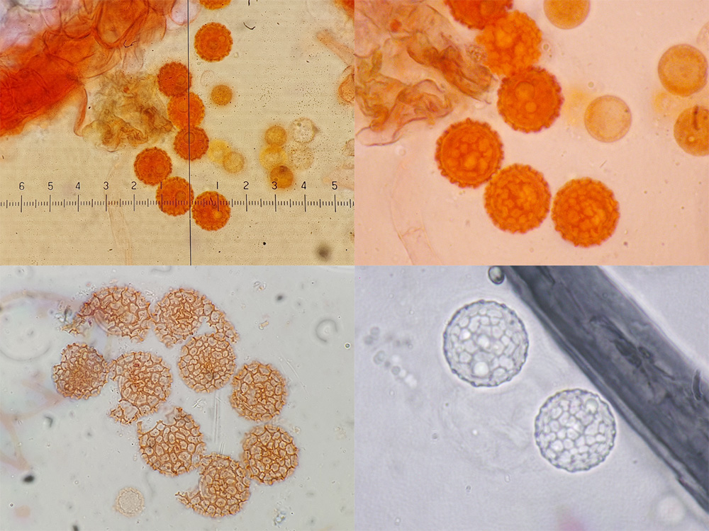 Sporen farblos, rundlich, warzig, die Warzen bis 2,5 µm lang und zu einem Netz verbunden, 11-13 µm im Durchmesser.