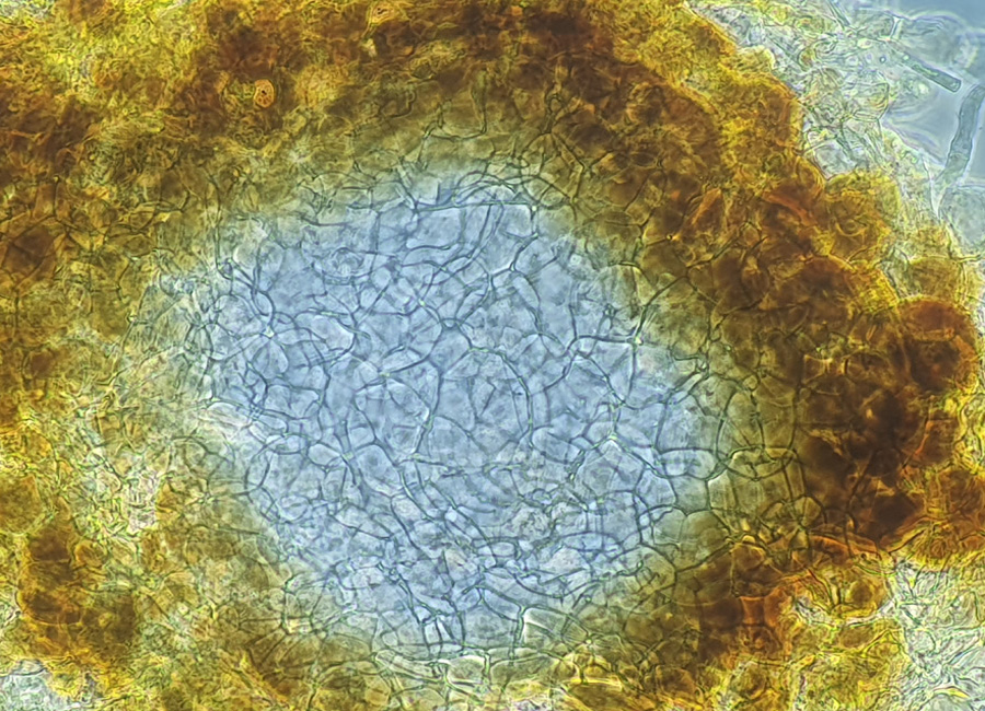 Das "Excipulum" ist natürlich nicht so klar umrissen, aber ich kann in der Anhäufung der zumeist eckigen Zellen keine Hyphen erkennen.