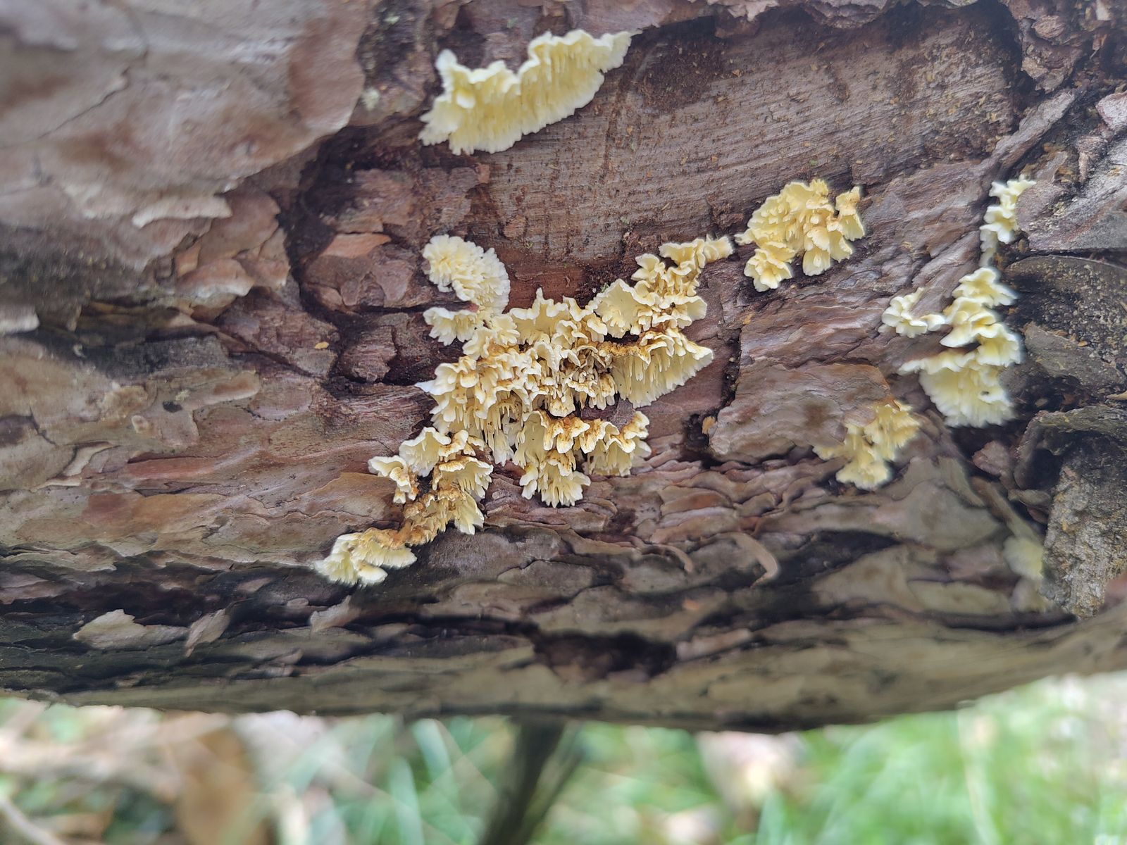Im Walliser Rohnetal, direkt auf der Sprachgrenze Deutsch-Französisch in einem der grössten Föhren(=Kiefern)-Wälder der Alpen bin ich einem mir unbekannten Baumpilz begegnet. Meine Recherchen wurden netterweise umgehend von Clavaria hier im Forum bestätigt: Es handelt sich um den Hängenden Eggenpilz Irpicodon pendulus, einer Rarität, die lokal einigermassen häufig ist. Hier an einer kürzlich gefallenen Föhre: