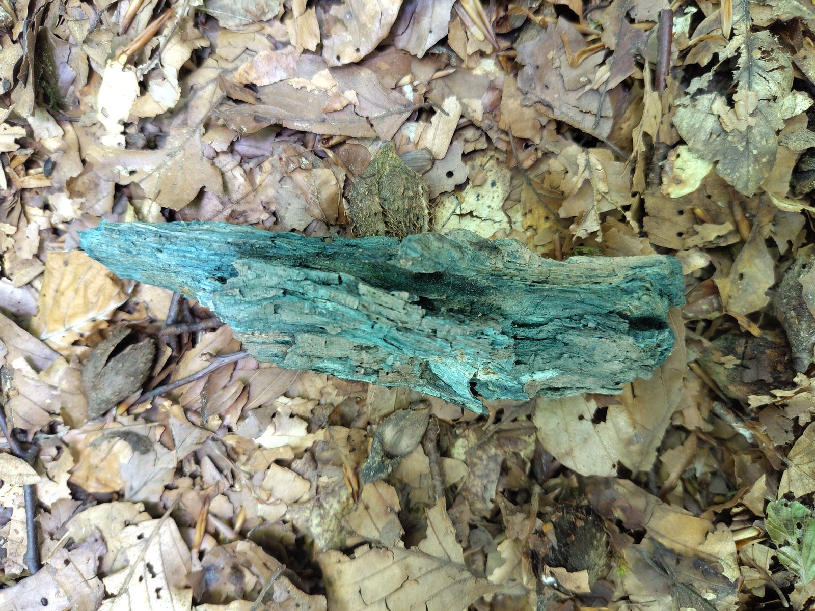 Zweimal hab ich in den letzten Wochen Holz, welches vom Kleinsporigen Grünspanbecherling Chlorociboria aeruginascens bewachsen wurde, gefunden. Prächtig, diese Farbvariante der Weissfäule: