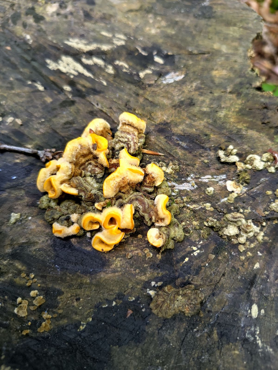 Leuchtend blickten diese jungen Striegeligen Schichtpilze Stereum hirsutum in meine Kamera: