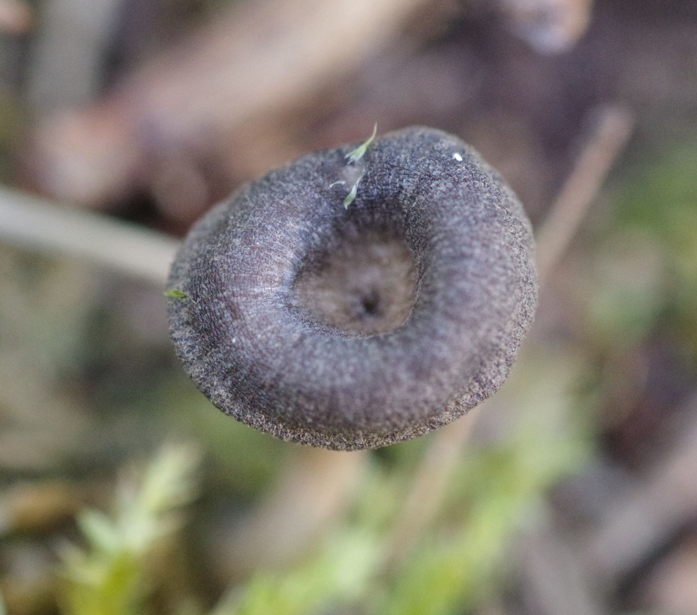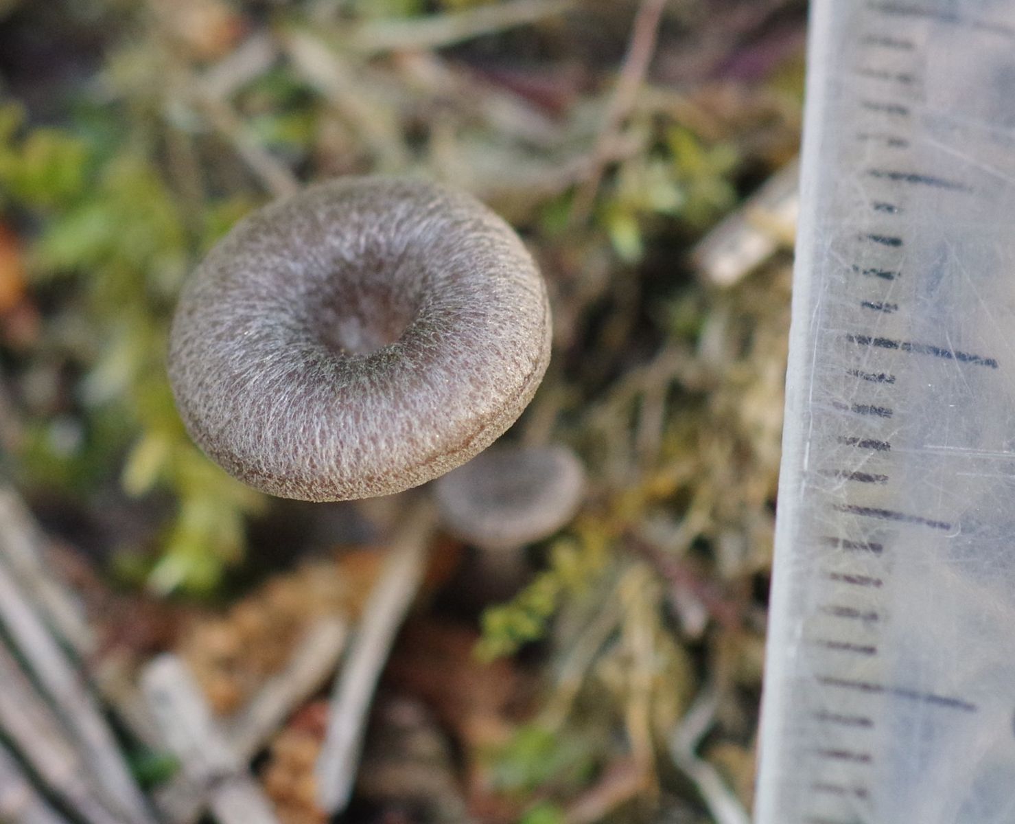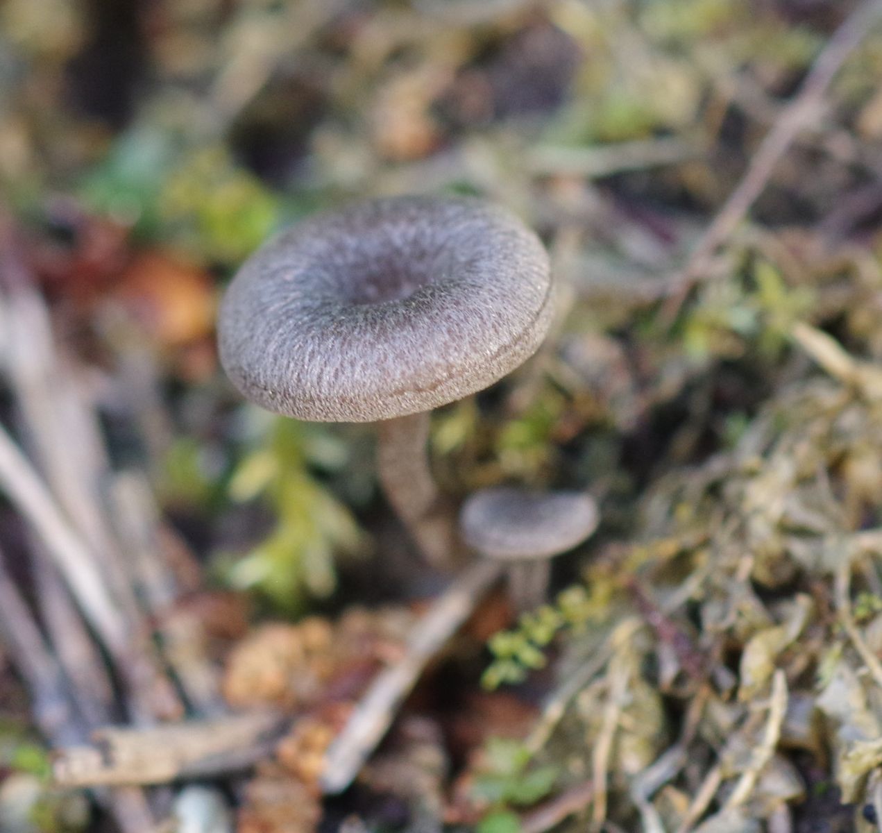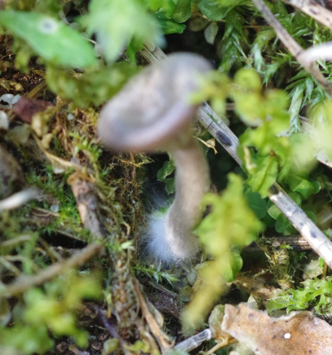 Diesmal eine Kollektion aus knapp 10 Exemplaren. Hut bis 10 mm groß, graufilzig, nicht durchscheinend, gewölbter Hut, genabelt, auffällig abgesetze Hutkrempe. Lamellen weit herablaufend. Stiel faserig, leicht weißlich faserig/bereift, am Ansatz deutliches weißes Myzelfilz.