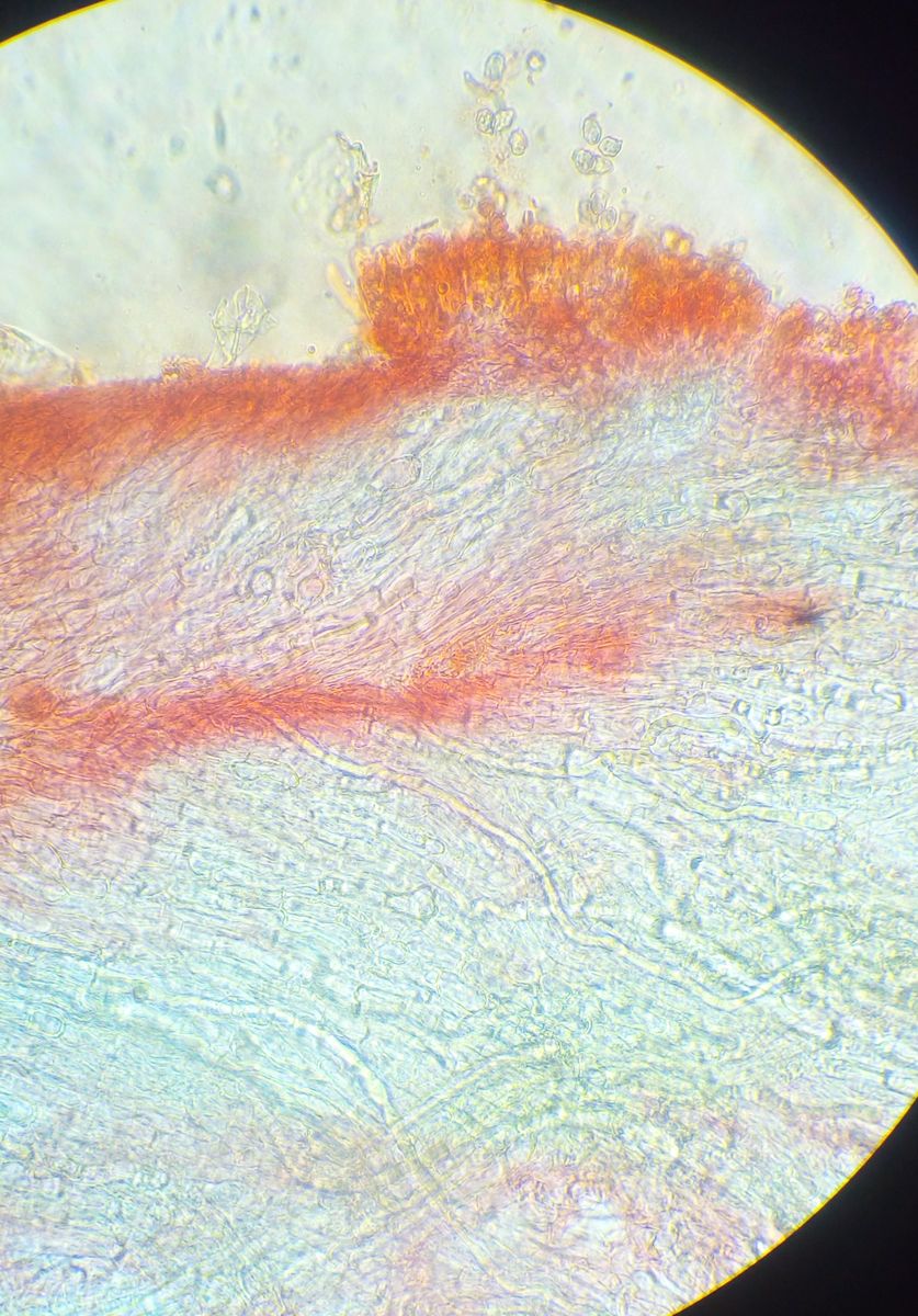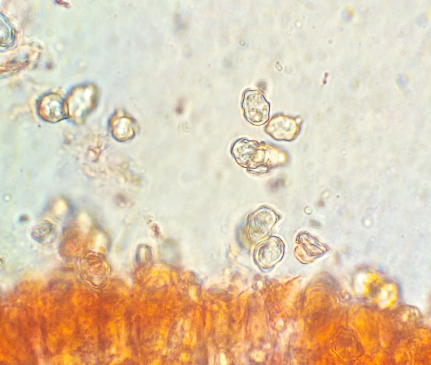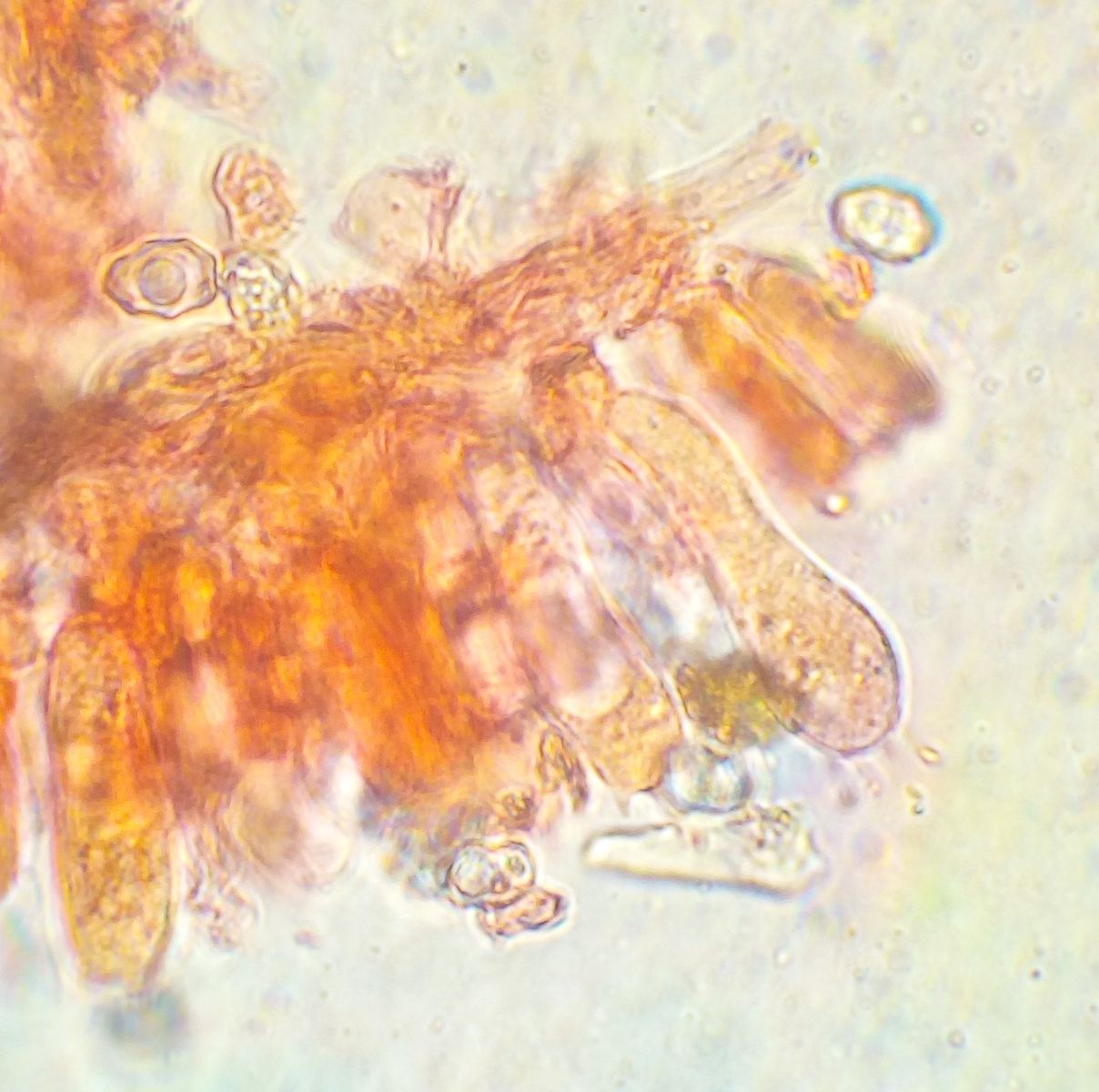 Cheilozystiden kann ich keine erkennen. Das Exemplar was ich mitgenommen habe, hatte keine Sporen mehr an den Basidien, ich konnte nicht erkennen wievielsporig die sind. Da müsste ich noch ein jüngeres Exemplar untersuchen. Sporen 7-9 (10)*5-6 vieleckig, variabel. Eindeutige Schnallen habe ich nicht gesehen.