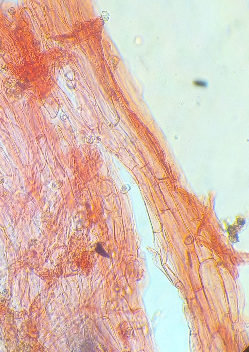 • N'abend, über Nacht hat es etwas geregnet und der Pilz aus Bild 2, 4 und 5 - der größere - ist bis auf 25 mm Durchmesser gewachsen, nachdem er vorher 3 Tage mehr oder weniger unverändert in Hitzestarre war (oder so). Die Basidien sind 4-sporig, ohne Schnallen. Auch sonst sind keine Schnallen zu finden.