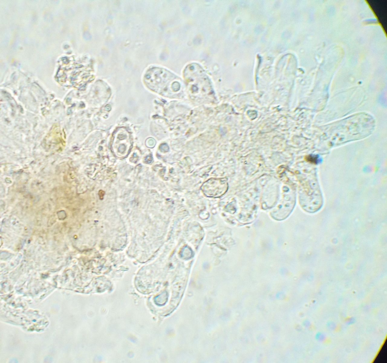 Cheilozystiden kann ich keine erkennen. Das Exemplar was ich mitgenommen habe, hatte keine Sporen mehr an den Basidien, ich konnte nicht erkennen wievielsporig die sind. Da müsste ich noch ein jüngeres Exemplar untersuchen. Sporen 7-9 (10)*5-6 vieleckig, variabel. Eindeutige Schnallen habe ich nicht gesehen.