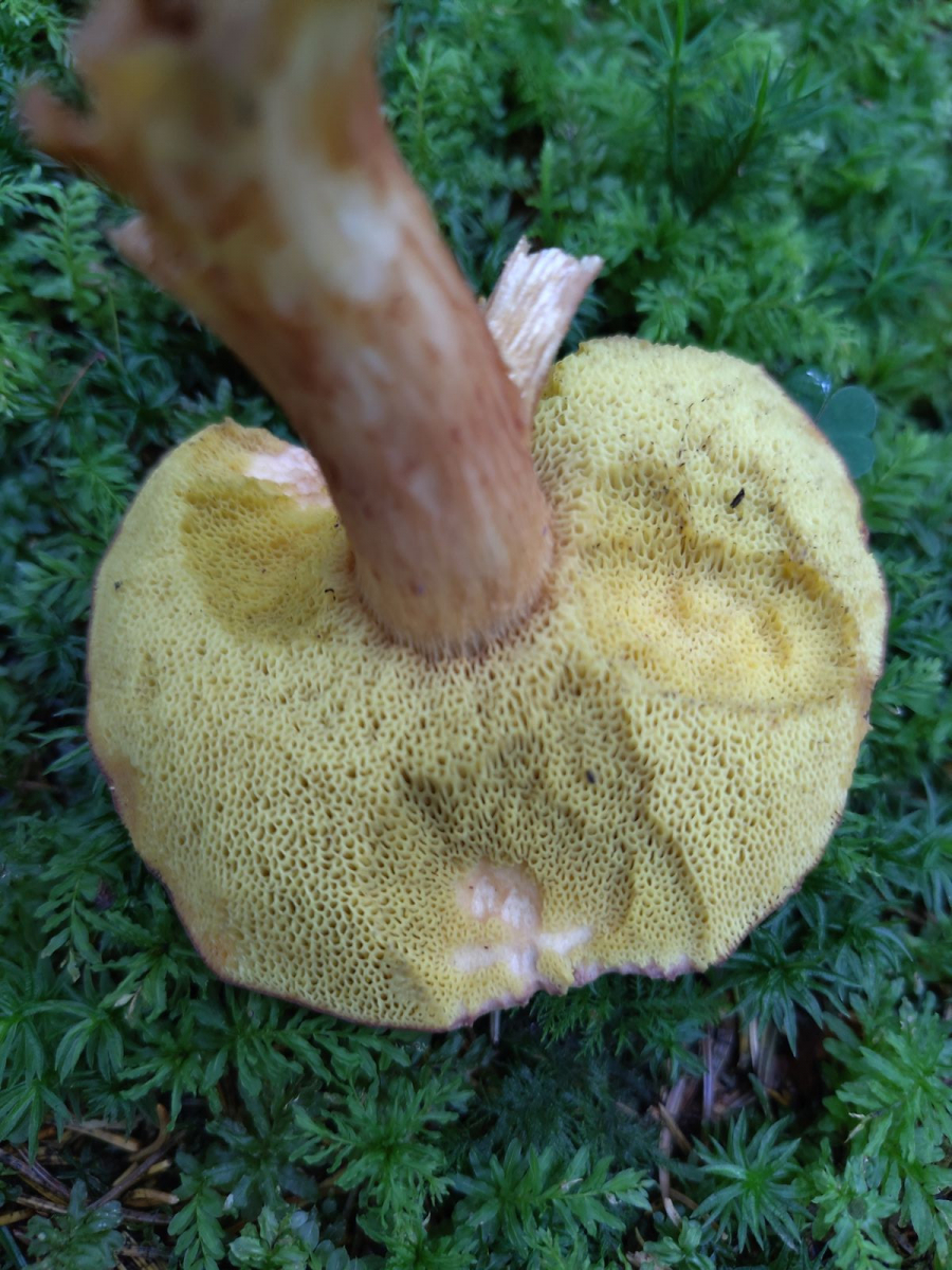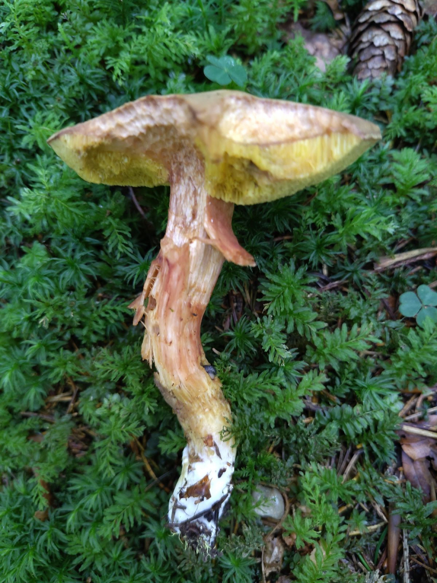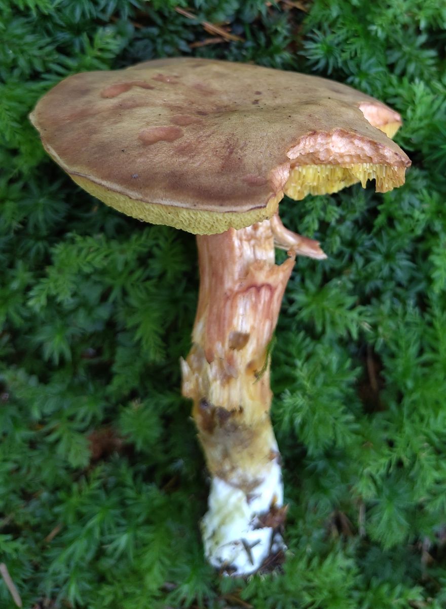 - Es sind nur einige Basalmyzelfäden gelb. Das deutet auf X. ferrugineus. Bei dem kann die Stielbasis offenbar gelb verfärben. Die Fichten und Buchen vor Ort sprächen auch dafür.