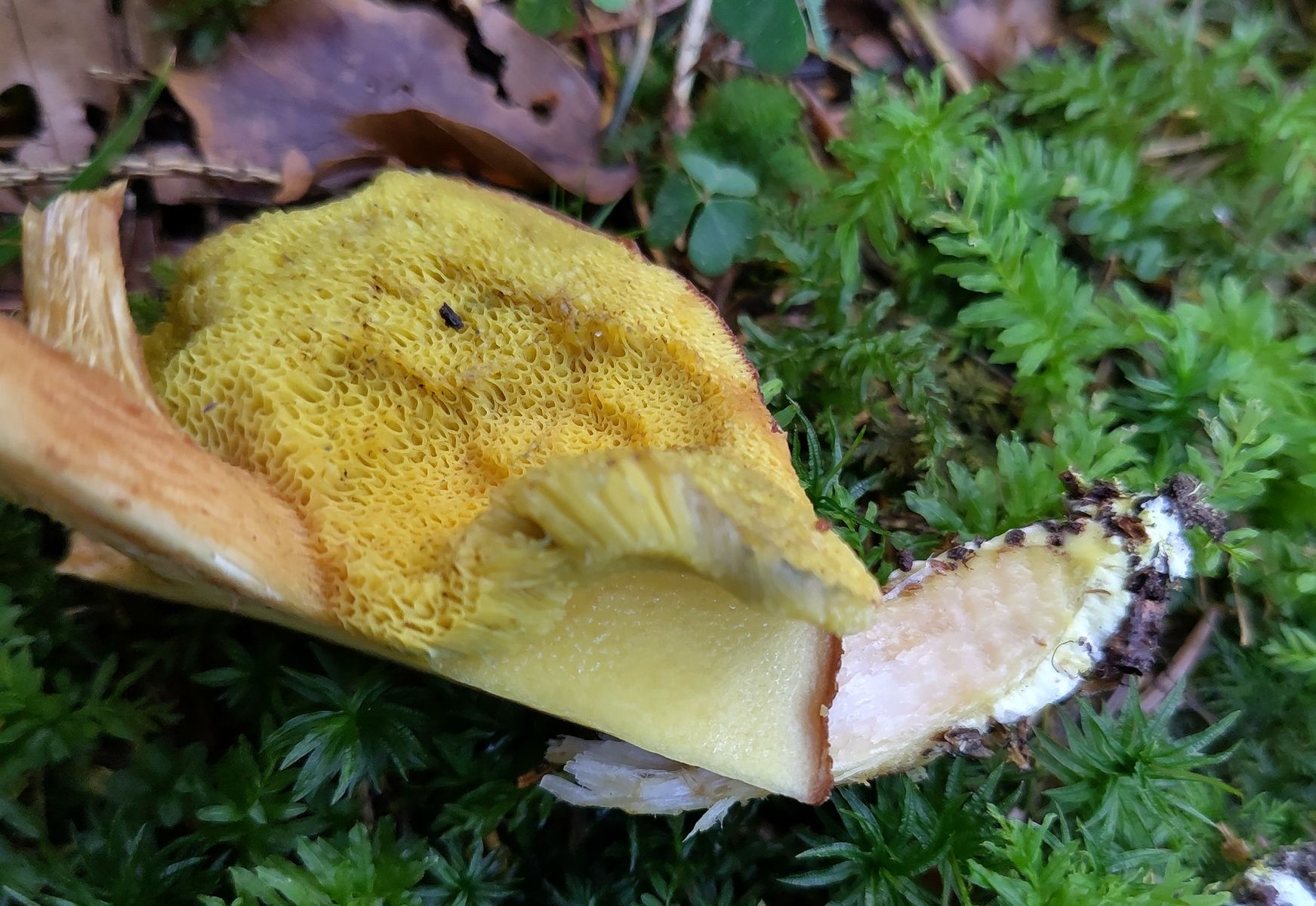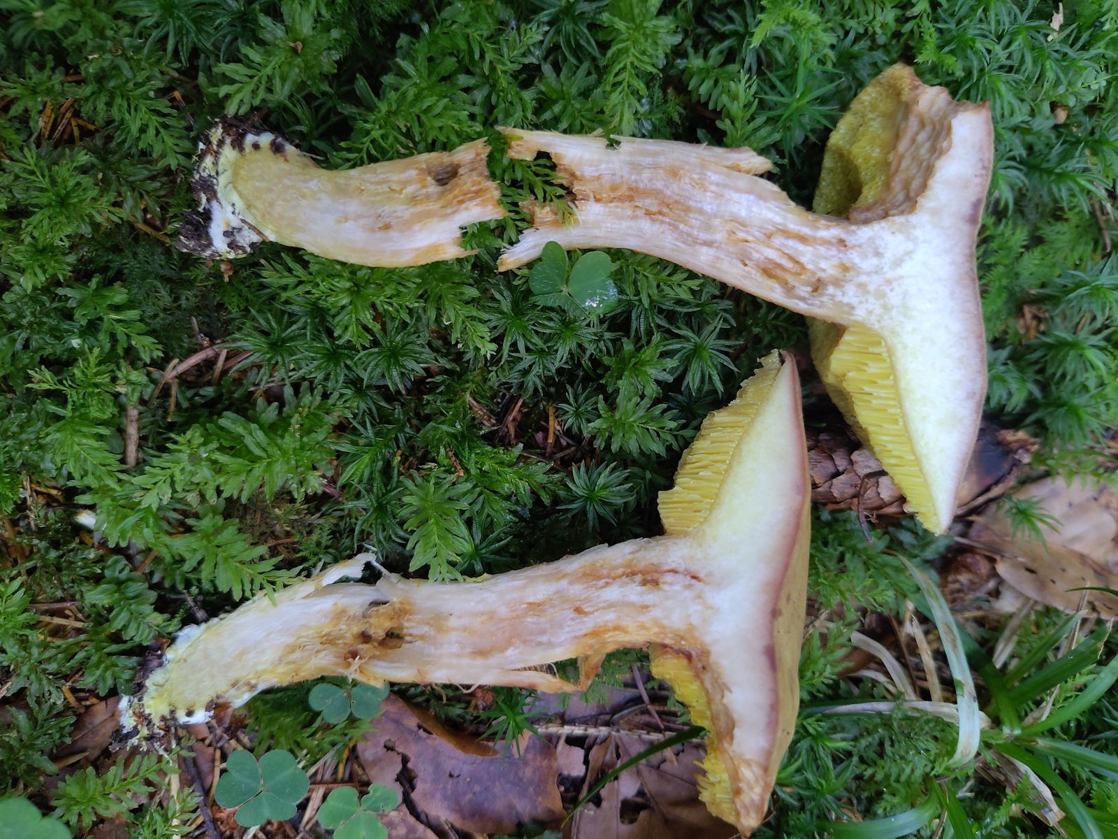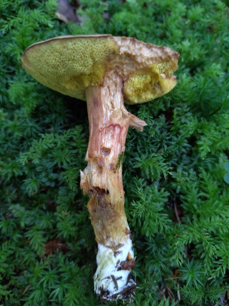 - Es sind nur einige Basalmyzelfäden gelb. Das deutet auf X. ferrugineus. Bei dem kann die Stielbasis offenbar gelb verfärben. Die Fichten und Buchen vor Ort sprächen auch dafür.