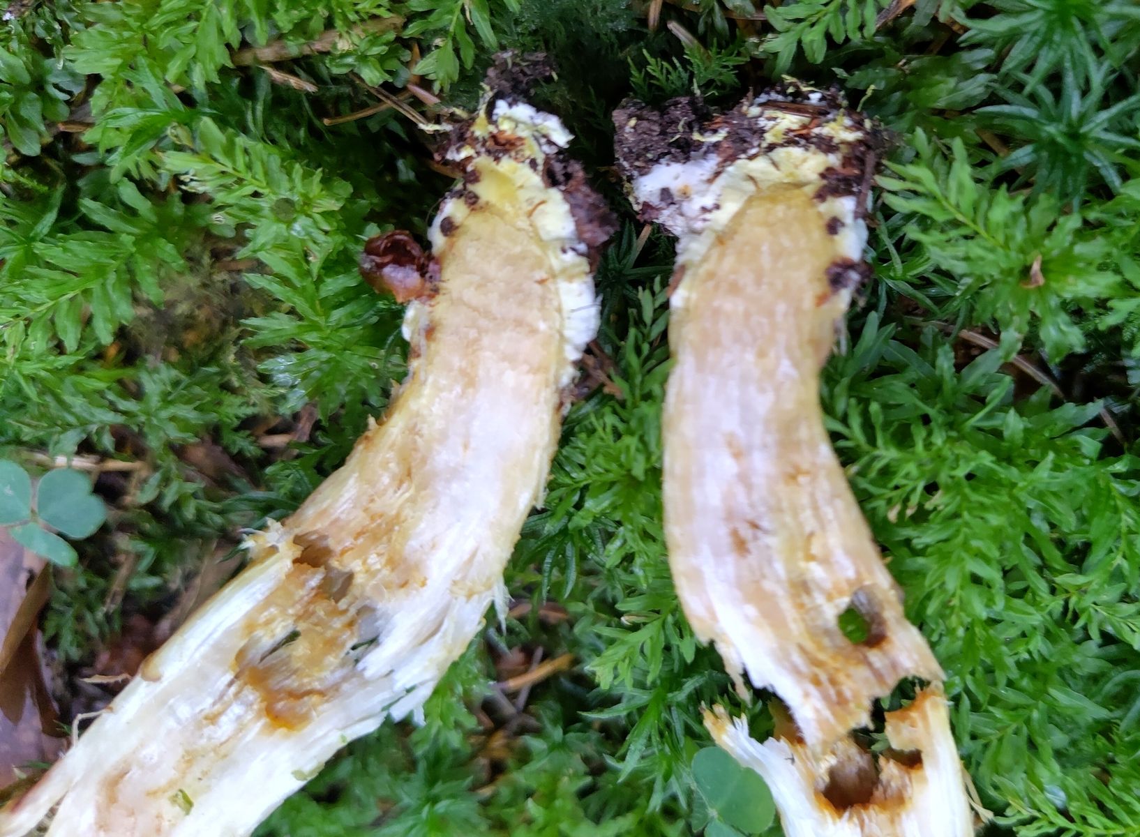 - Schnittbild: etwas beeinträchtigt durch Frass von Maden und Schnecken... grundsätzlich hell (beige-weiss), an Frassstellen rotbräunend, ganz unten in der Basis gelb