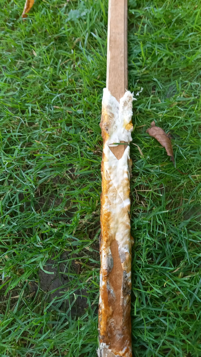 in einem Schuppen, wo Holz gelagert wird, habe ich einen Pilz mit braunen Sporen entdeckt. Dieser besteht aus einer Unterseite und darüber eine weitere Schicht aus braunen Röhrchen. Die Unterseite ist weiß und ca 1 mm dick. (vgl. Bilder). Die Sporen befinden sich im gesamten Schuppen und überziehen alle Gegenstände mit einer braunen Schicht.