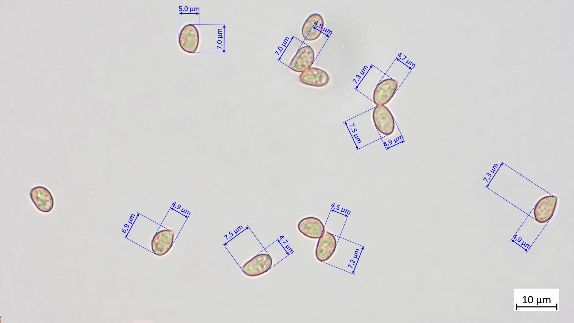 Ich habe 37 Sporen gemessen: 7.1 µm (6.1 - 7.7 µm) x 4.7 µm (4.4 - 5.3 µm), Q = 1.51 (1.22 - 1.71)