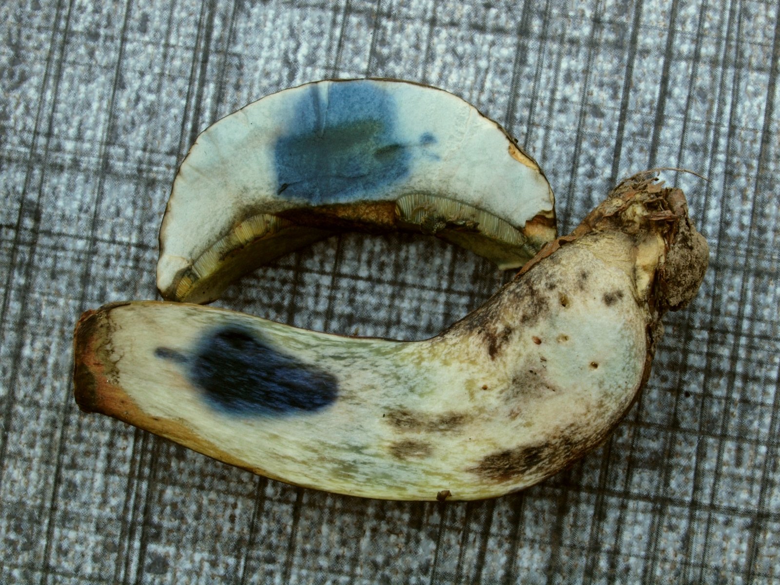 Zum Glück hatte ich ein Exemplar eingepackt. Nach Entfernung des Hutes waren unter der Stereolupe große Maschen an der Stielspitze zu sehen und ich habe die Reaktion mit Jod (Melzer) im Fleisch geprüft. Die amyloide Reaktion spricht eindeutig für den "normalen " Schönfuß, da diese Reaktion bei Calobeletus polygonius fehlen soll.