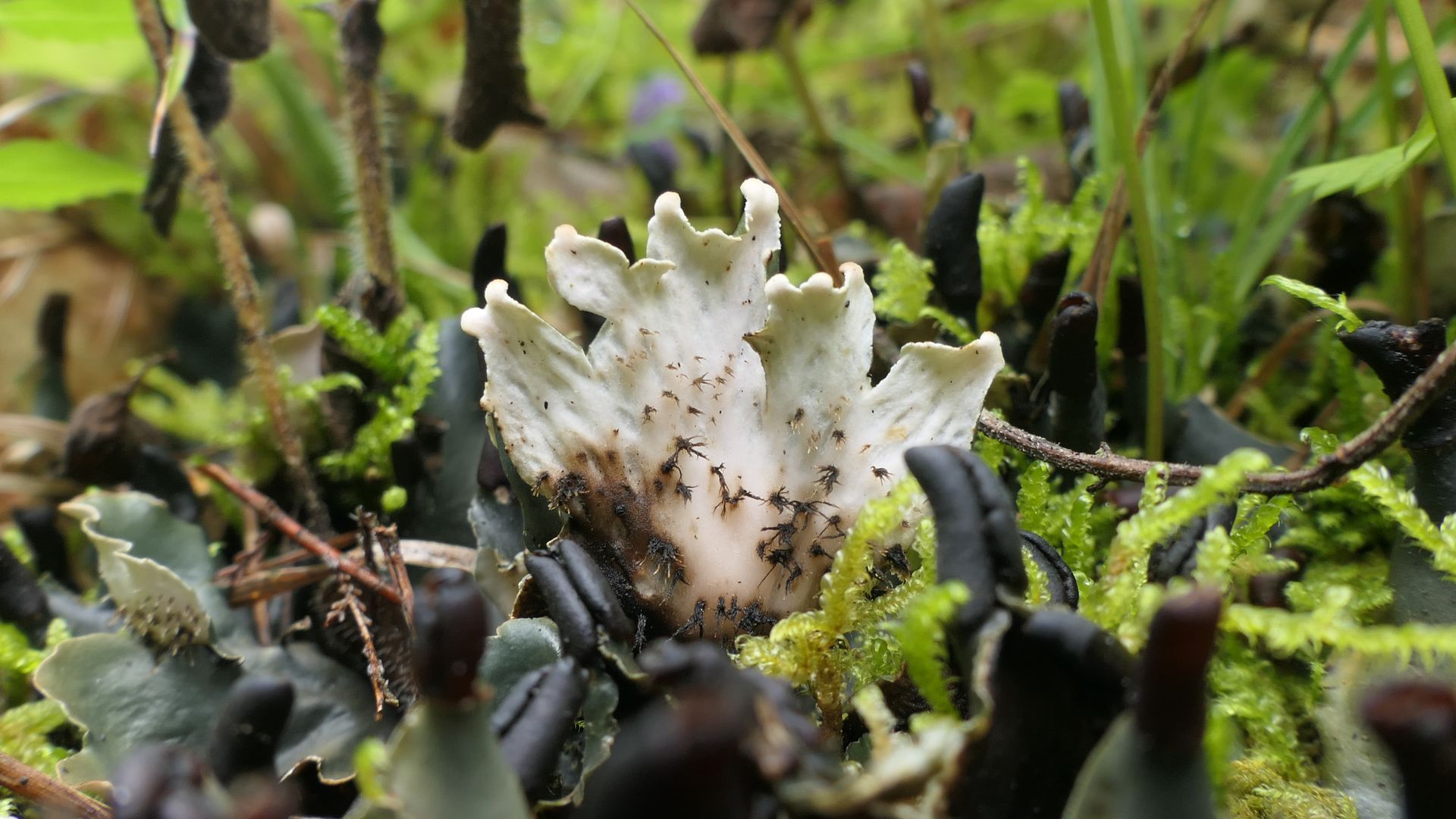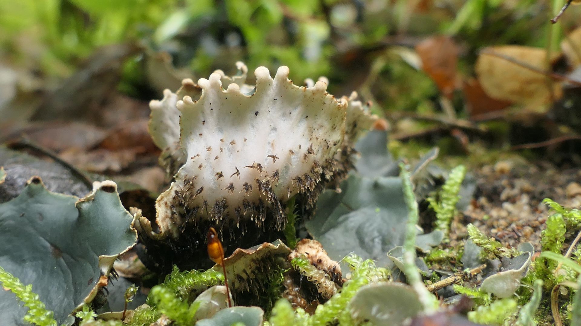 Etwas weiter zur Mitte hin kleine, weit auseinander stehende Büschelchen dunkler Rhizinien;
